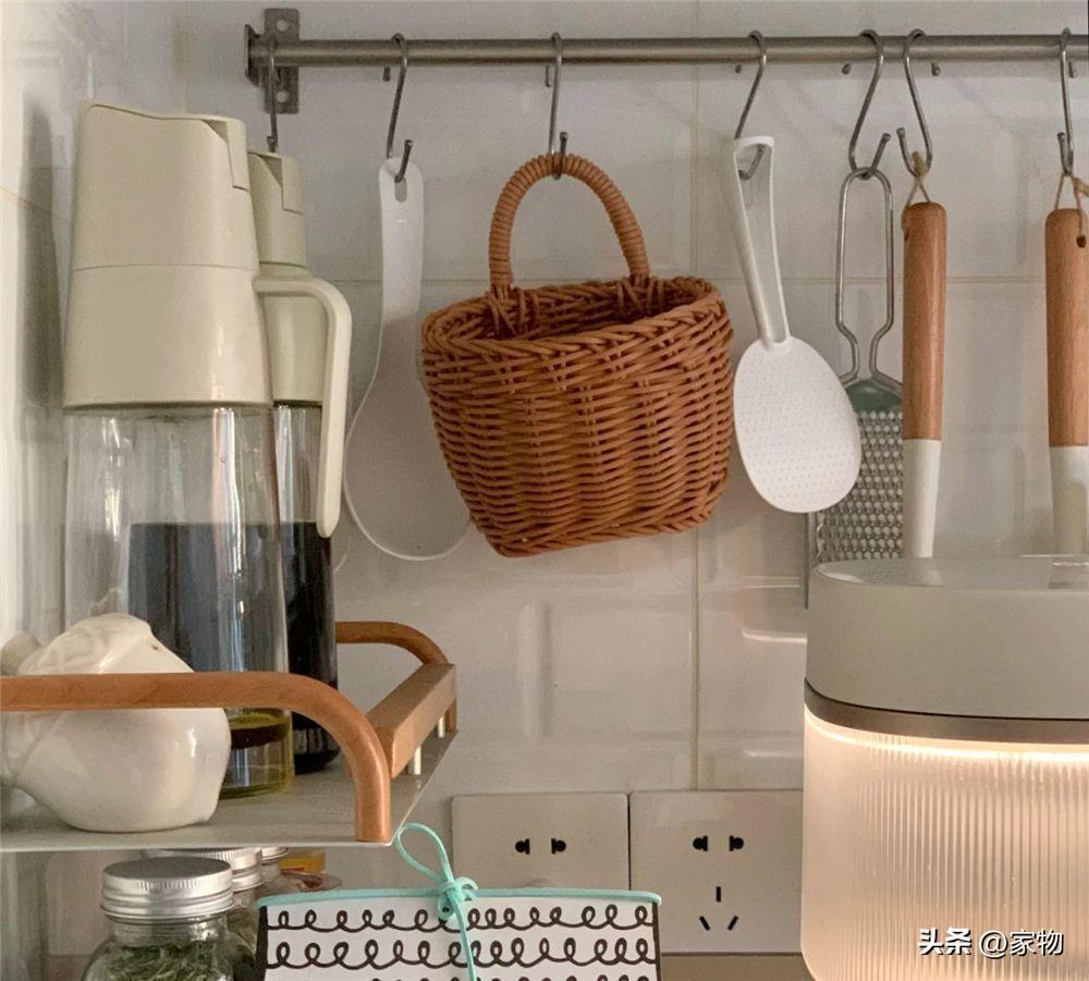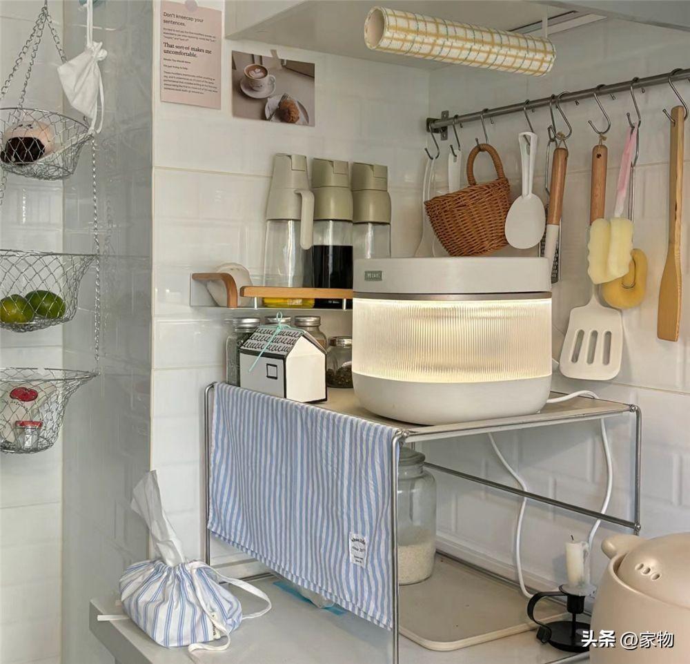 架子的高度也經過仔細篩選,上下兩層高度正好能放下各種各樣的廚房雜物,同時不會遮擋住牆面上的插座,兼顧收納能力的同時,實用起來也絲毫不會覺得不便。