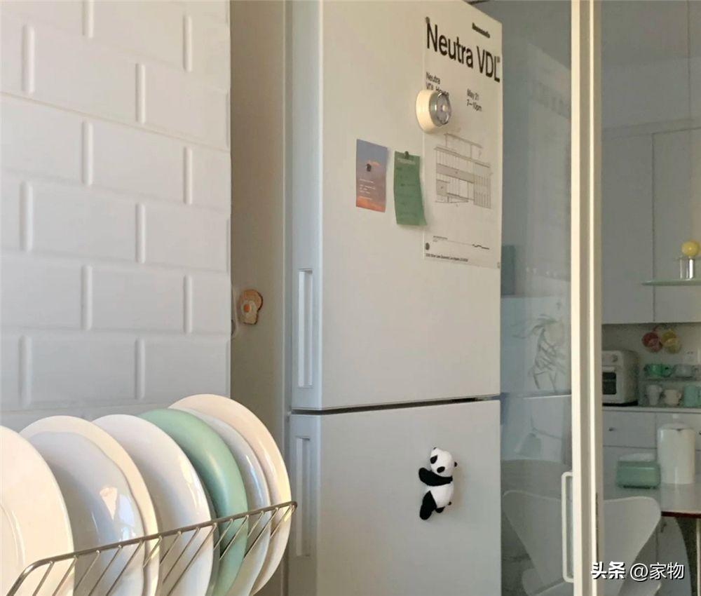 和很多小戶型的廚房不一樣,這間廚房雖然面積不大,但卻留出了一個可以放冰箱的凹槽,剛好將冰箱嵌入這處空間後,廚房看起來就像是個方方正正的小區域,一體感更強。