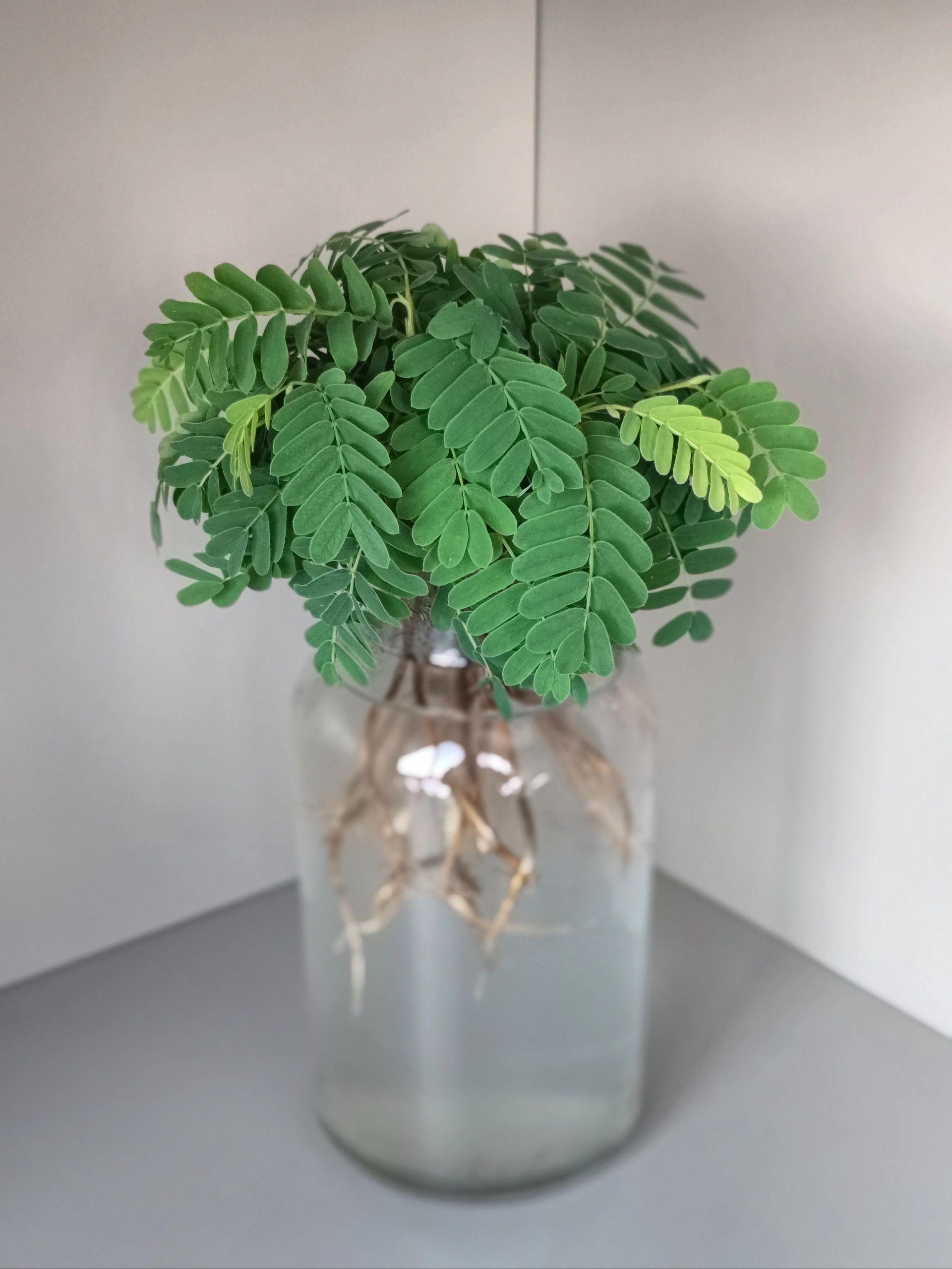 上圖就是酸角苗長茂盛之後的樣子,大約經歷了50天。這時候的酸角盆栽觀賞性極強,葉片擁簇在一起,圓圓的很可愛,顏值非常高。而且到了日落後,它的葉片會閉合,而到了日出後葉片又會打開特別的有趣。平時只要放在光線充足的地方(但不能暴曬),定期換水即可。