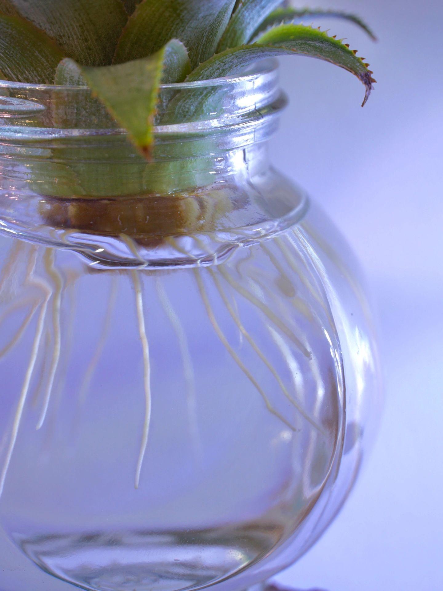 這個方法非常簡單:選擇一個瓶口剛好能容納菠蘿頭的瓶子,倒入自來水,水位應剛好淹沒菠蘿頭底部的芽點,但不要讓水接觸到菠蘿葉。將瓶子放在陽光充足的地方。在菠蘿頭髮芽前,每兩天更換一次水;發芽後,水大約每週更換一次即可。