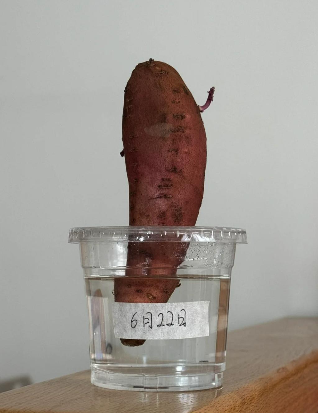 方法比前面用果核的更簡單,只需要把紅薯的一小部分泡在水裏,三四天一換水即可。