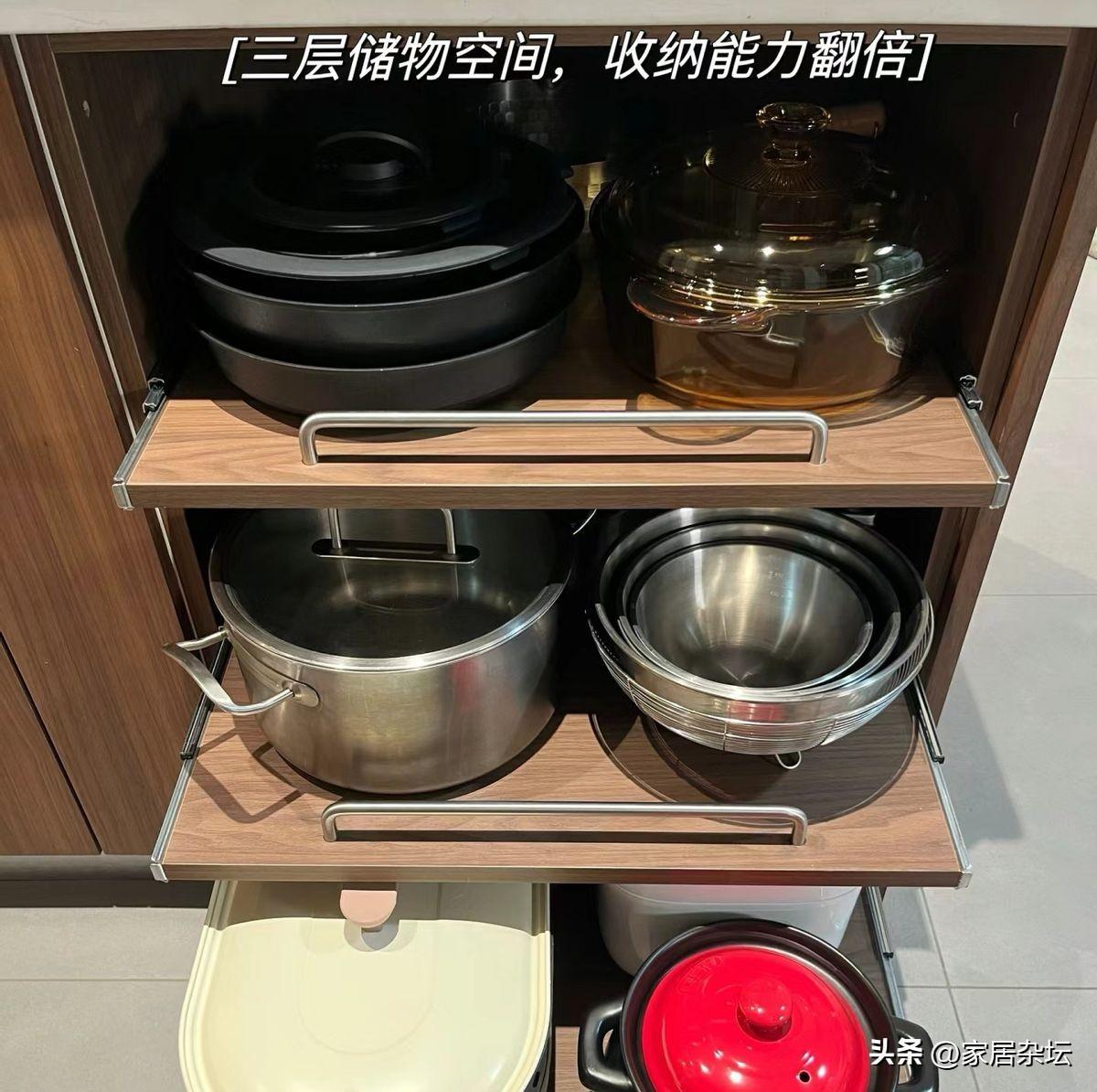 常規的地櫃,根據鍋具的高度,可以做成3層抽拉收納櫃。甚至有的可以做到4層。