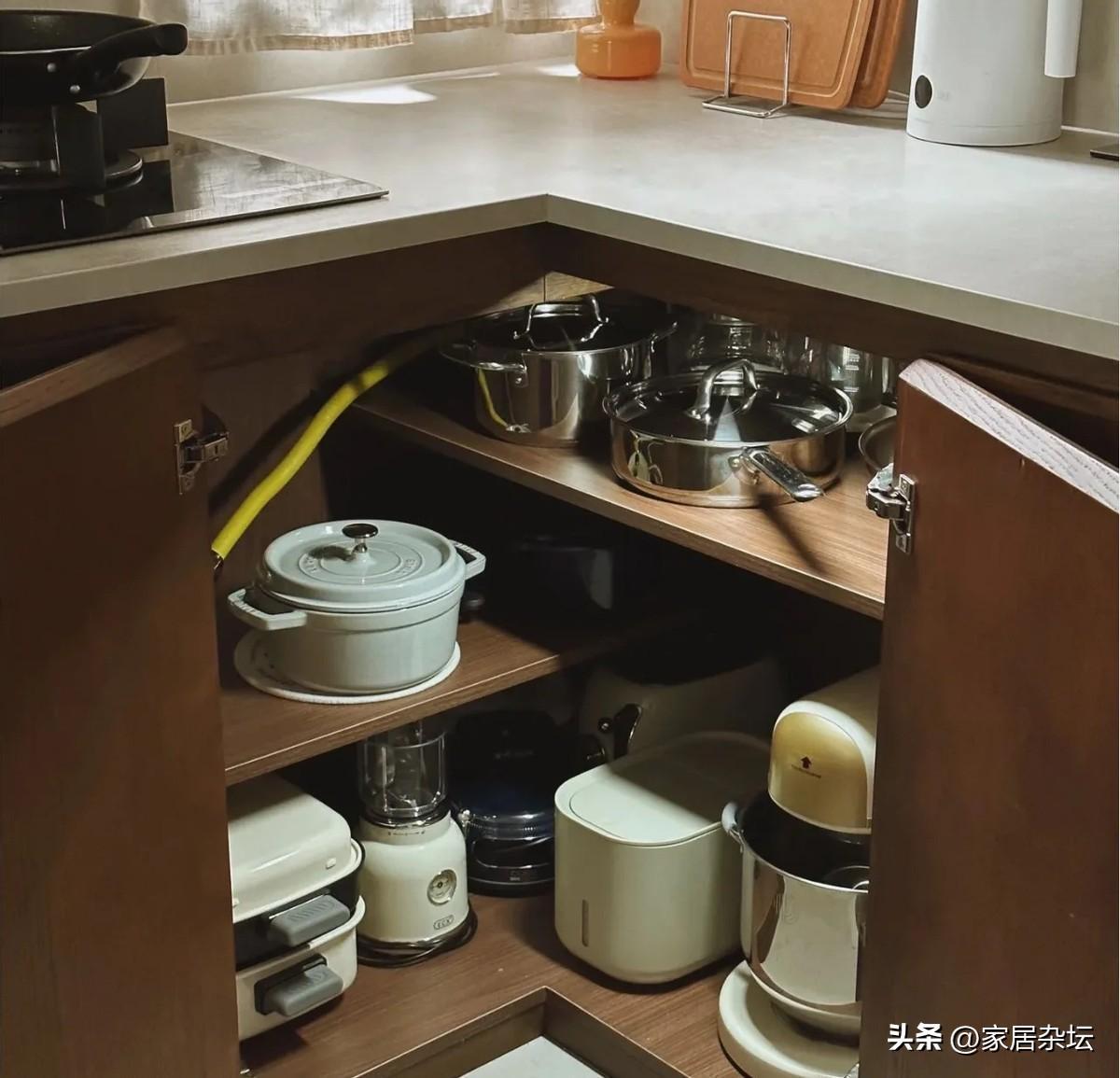 因爲對於大多數廚房的櫥櫃,由於它是有一個轉角的,所以在轉角的部位,就出現了收納的問題。