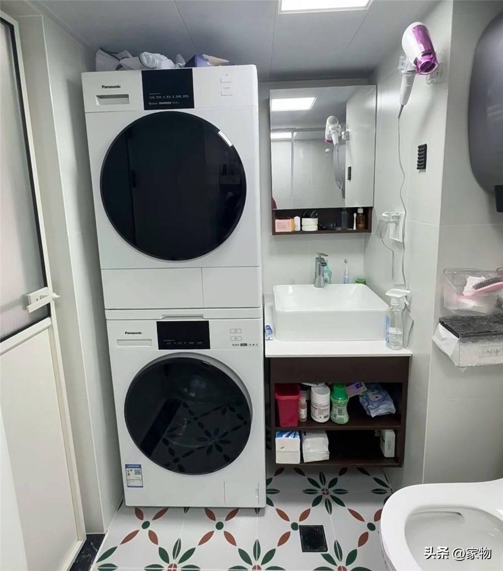 家裏的衛生間雖然很小,但卻非常實用,裏面不僅塞下了洗漱、如廁、沐浴的空間,同時還放着一組洗烘套裝,日常洗衣甩幹後直接丟到烘乾機裏,都免去了晾曬的麻煩。