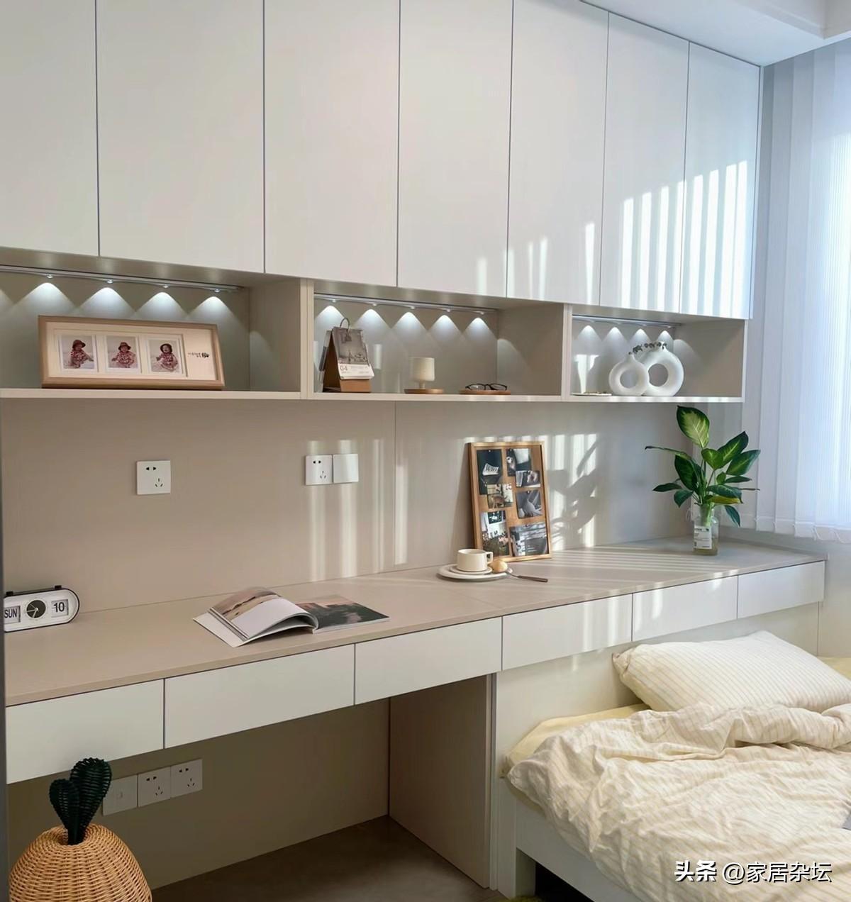 ①、實現了房間的功能的需求。例如房間裏我們設置了收納區,設置了學習區,把牀、書桌、衣櫃整合在一起。