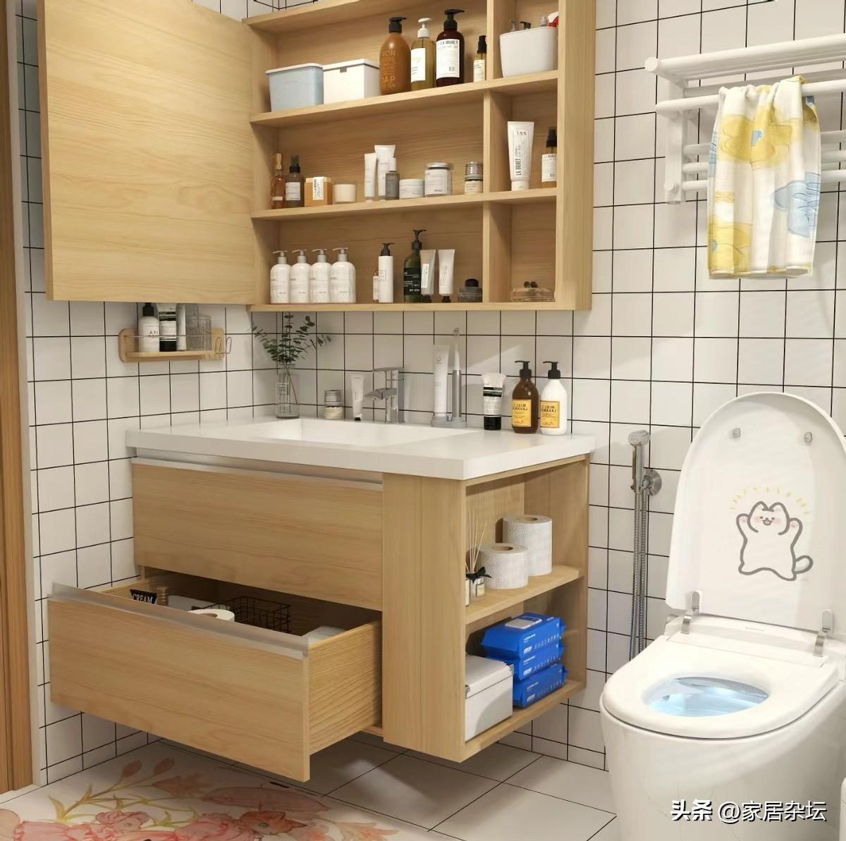 其實有一個很不錯的做法,就是側面開櫃。因爲很多衛生間的佈局是馬桶就是在洗臉盆的側邊。