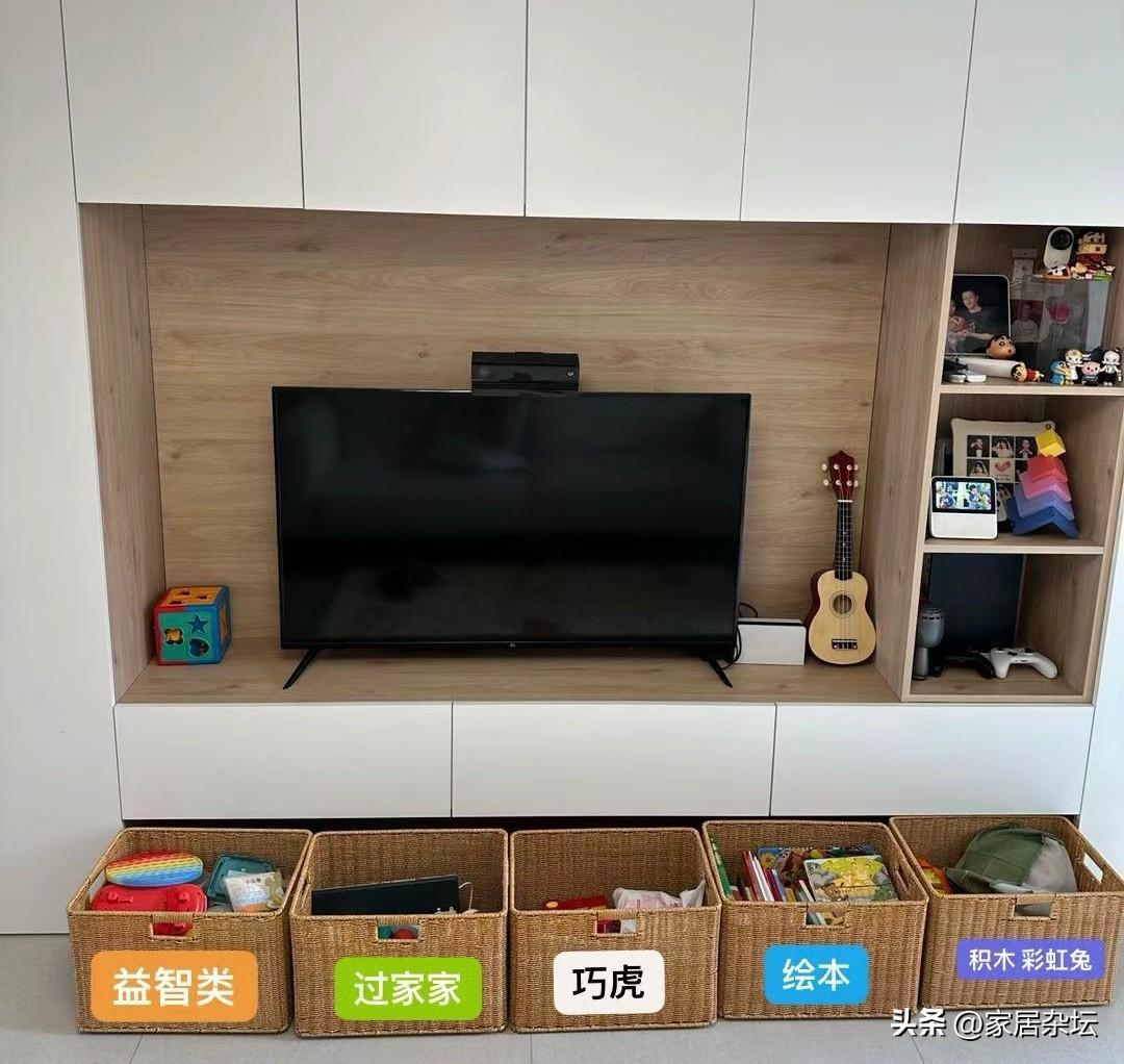 玩具櫃的具體做法,就是可以在電視櫃的底部,預留幾個大概高度在四五十釐米的開放式櫃子,用來做玩具櫃。