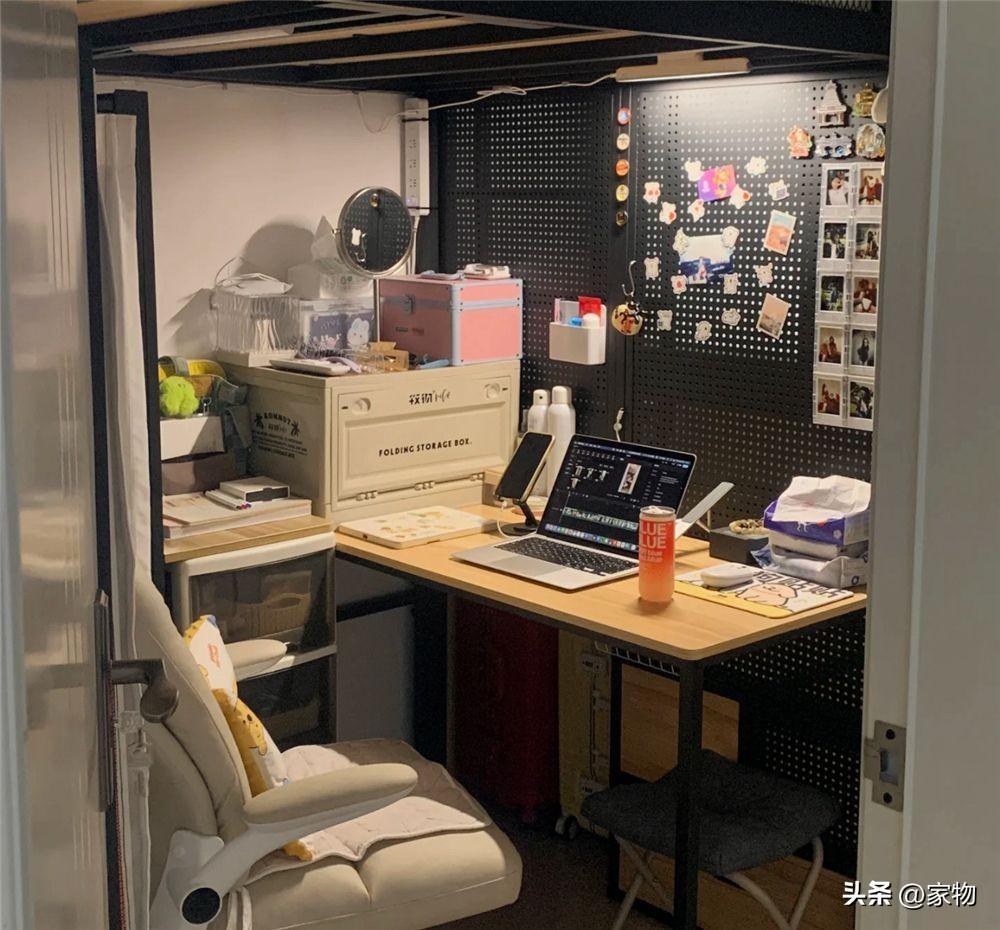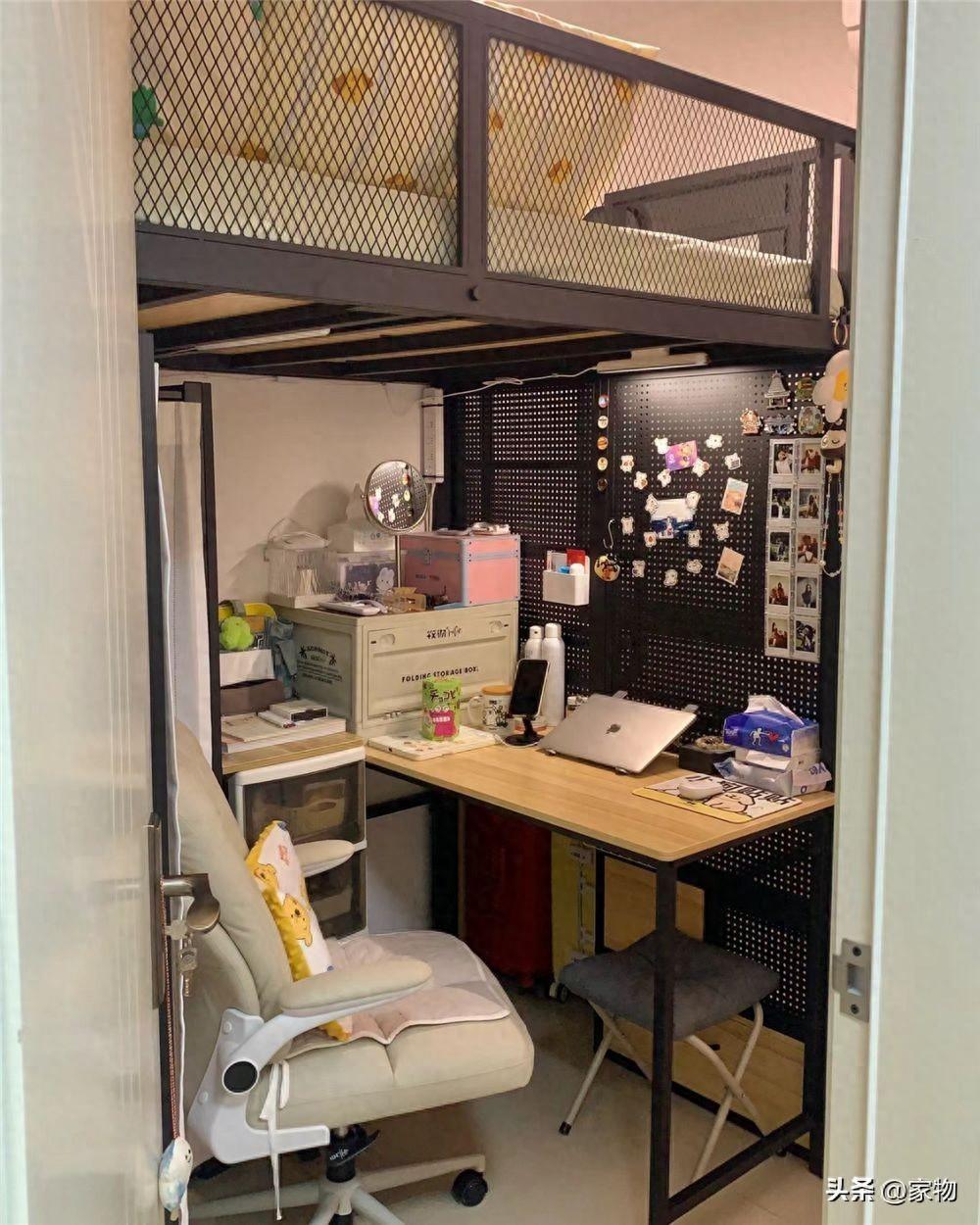 她利用上下鋪牀架隔出一個舒服的上鋪牀,以及下鋪辦公學習桌,還在周圍做了足夠且豐富的收納空間,可謂是又好看又好用,來看看~