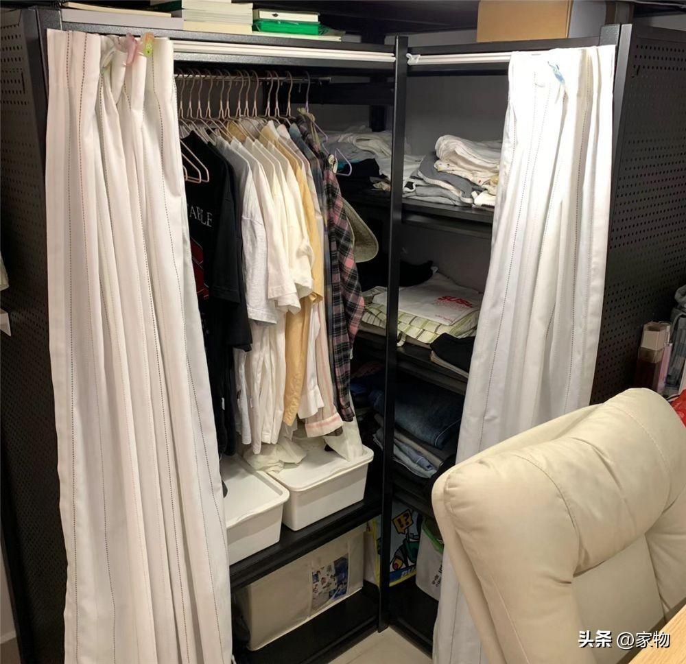 4㎡的小小次臥室,居然也能塞下一組衣櫃,不僅有掛衣區還有疊放櫃格區,一道掛簾代替櫃門將衣櫃分割而開,雖說佔用了本就不富裕的空間,但也算是物盡其用。