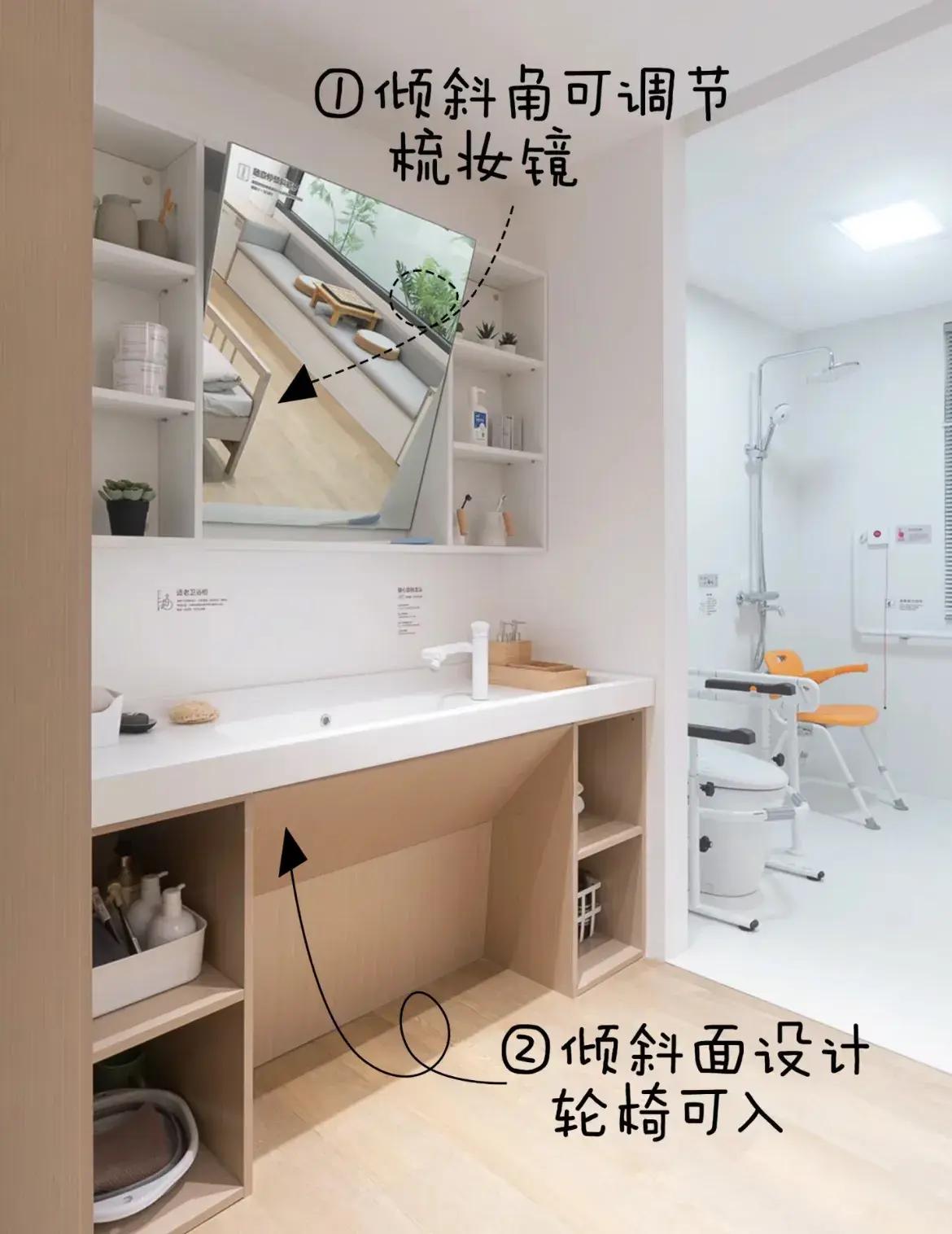倘若老人到了需要依靠輪椅行動的時期,必要的話,浴室櫃下方做傾斜面設計,方便輪椅進出,鏡子也可以做帶傾斜角的化妝鏡。