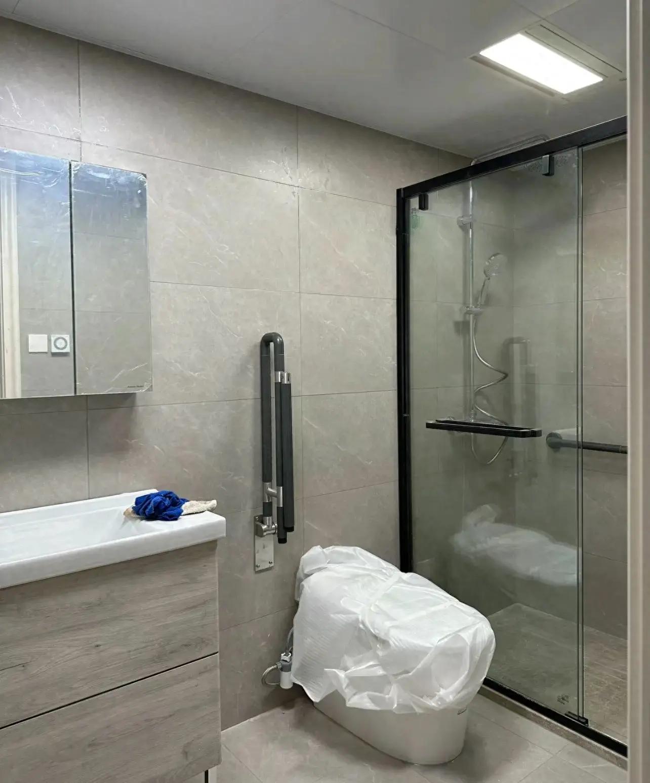 下圖就是一個反面案例:無腦裝了一堆扶手,地面卻沒有防滑措施,還存在燈光昏暗、淋浴間地方狹小等等問題。