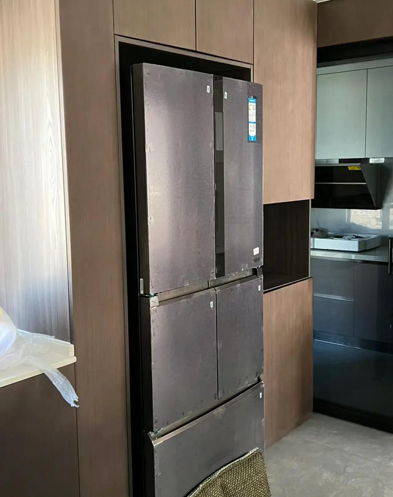 這是注意了冰箱厚度,尺寸也完全按照冰箱尺寸去預留,但忽略了,牆面地面要預留公差,導致最終冰箱還是嵌不進去。