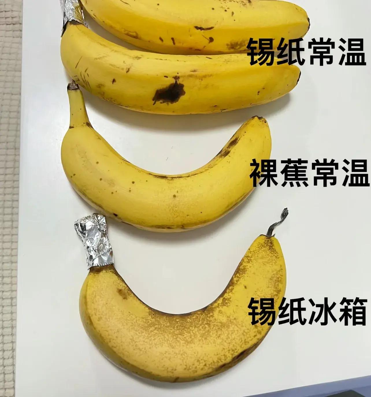 下面是一個香蕉保存的測試,分別把香蕉放在常溫、香蕉錫紙包裹放在常溫、錫紙包裹放在冰。
