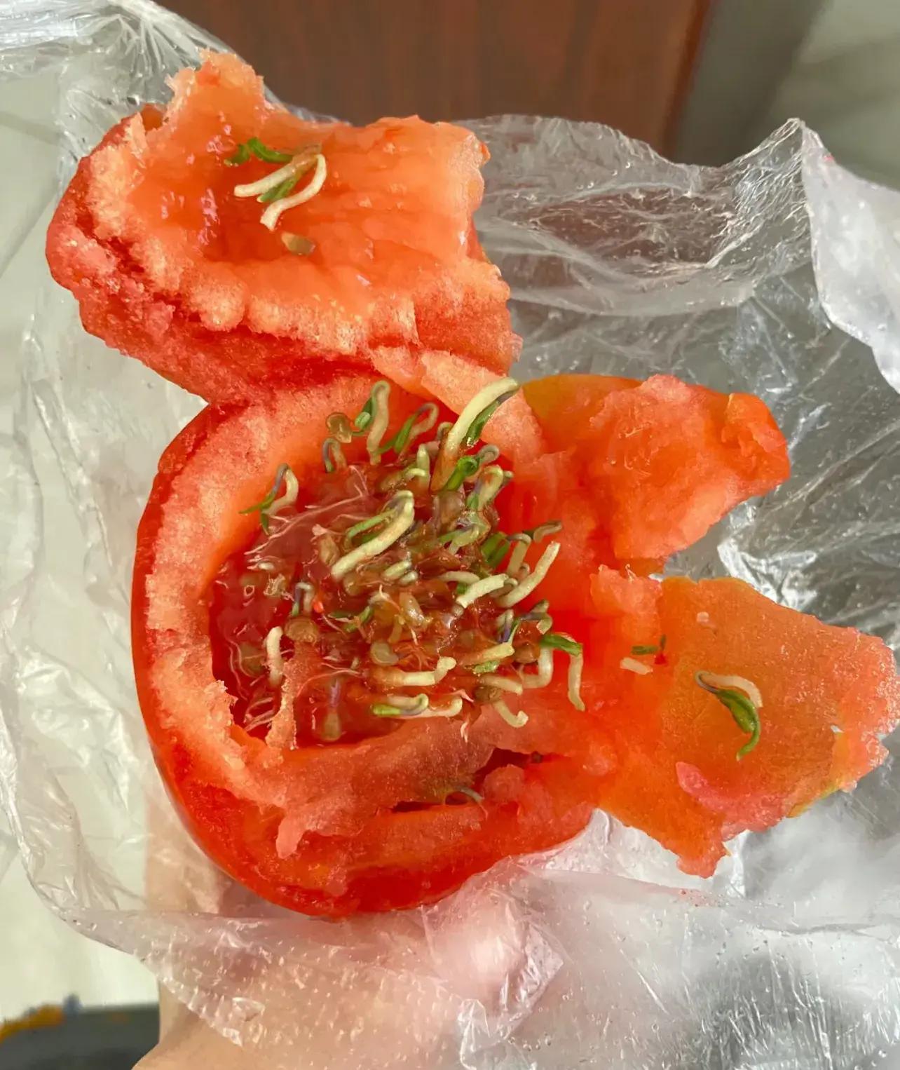 住友先冷藏後放室溫,西紅柿以爲冬天過去了,春天來了,就自己默默的發芽了。