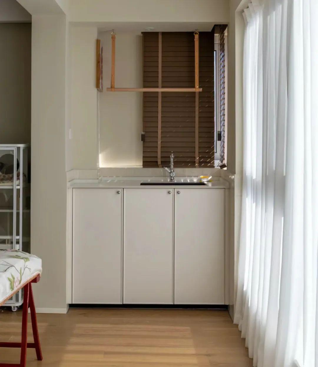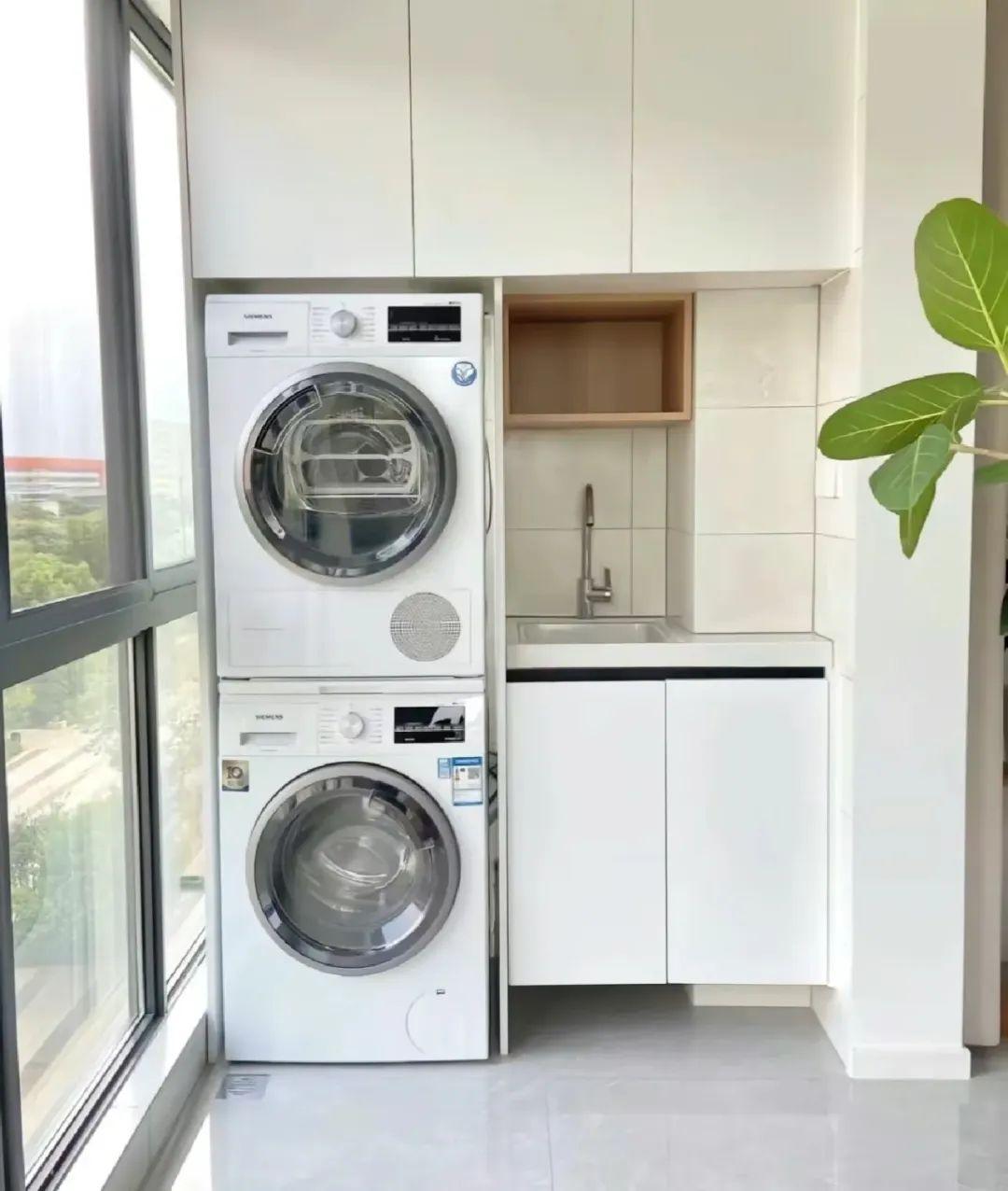 小陽臺更好的佈局方案還是,把洗衣機和洗衣盆裝在陽臺的兩側,也不用過於擔心採光,因爲洗衣盆不高,住進去你會發現真正擋光的是晾曬的衣服。