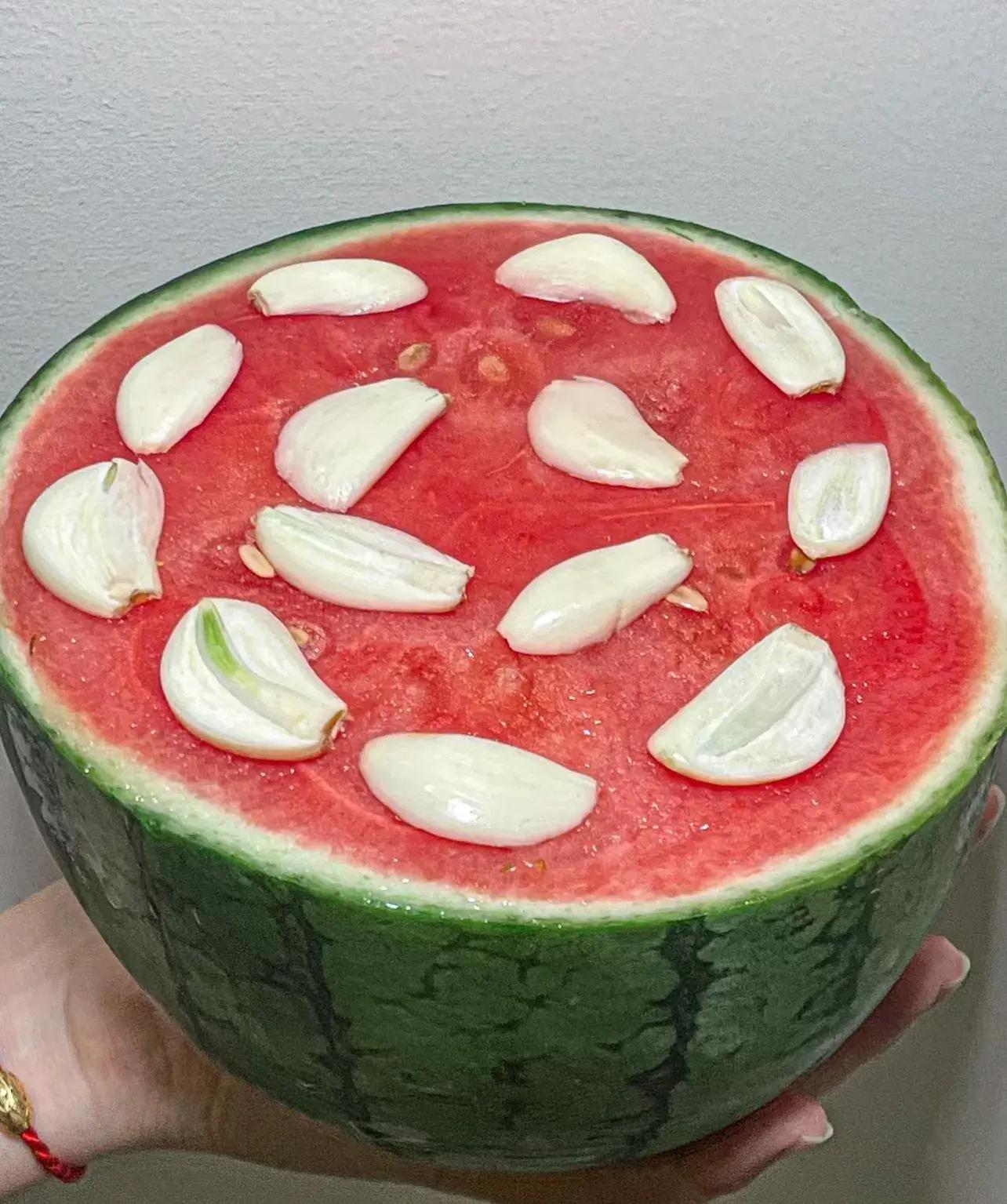 24、給西瓜蓋保鮮膜、放大蒜……措施均不能有效抑制細菌生長,唯一有效的辦法是當天喫掉,或者第二天喫的時候,把暴露的截面切掉。