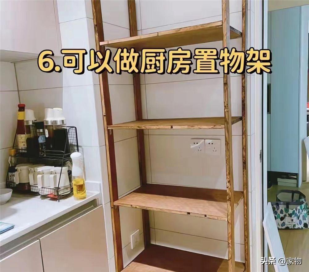 剩下的髒舊板材,也完全可以做成廚房的置物架,本身板材就算是廢物利用,即便是用在廚房這種多油污多潮溼的地方,有所髒損也無所謂,還可以根據廚房格局尺寸精準配置。