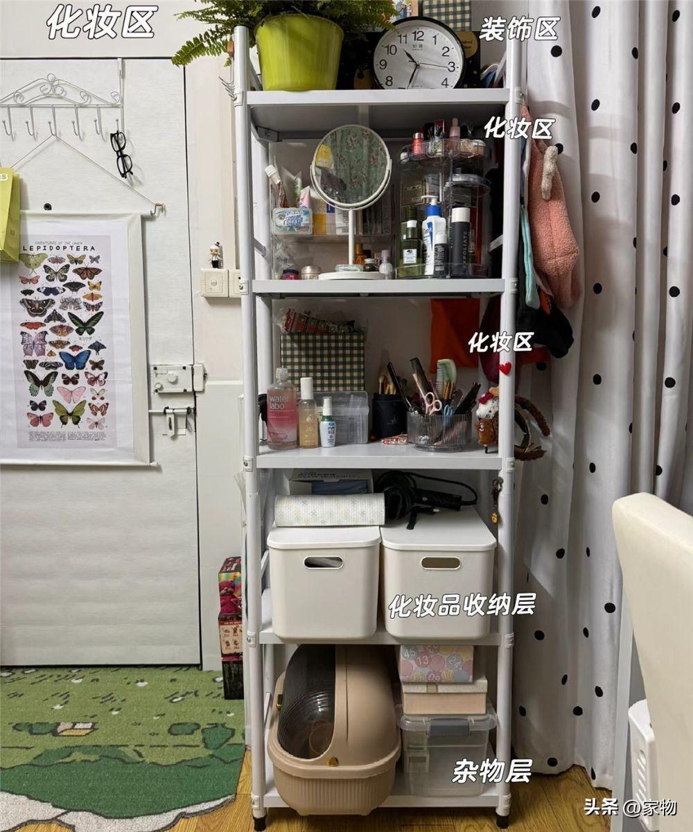 門口的架子,也將轉角的小空間儘可能利用了起來,家裏的各類化妝品,都堆疊在這樣一組架子上,它佔地面積不大,卻能將縱向空間利用起來,真的很適合這類小戶型。