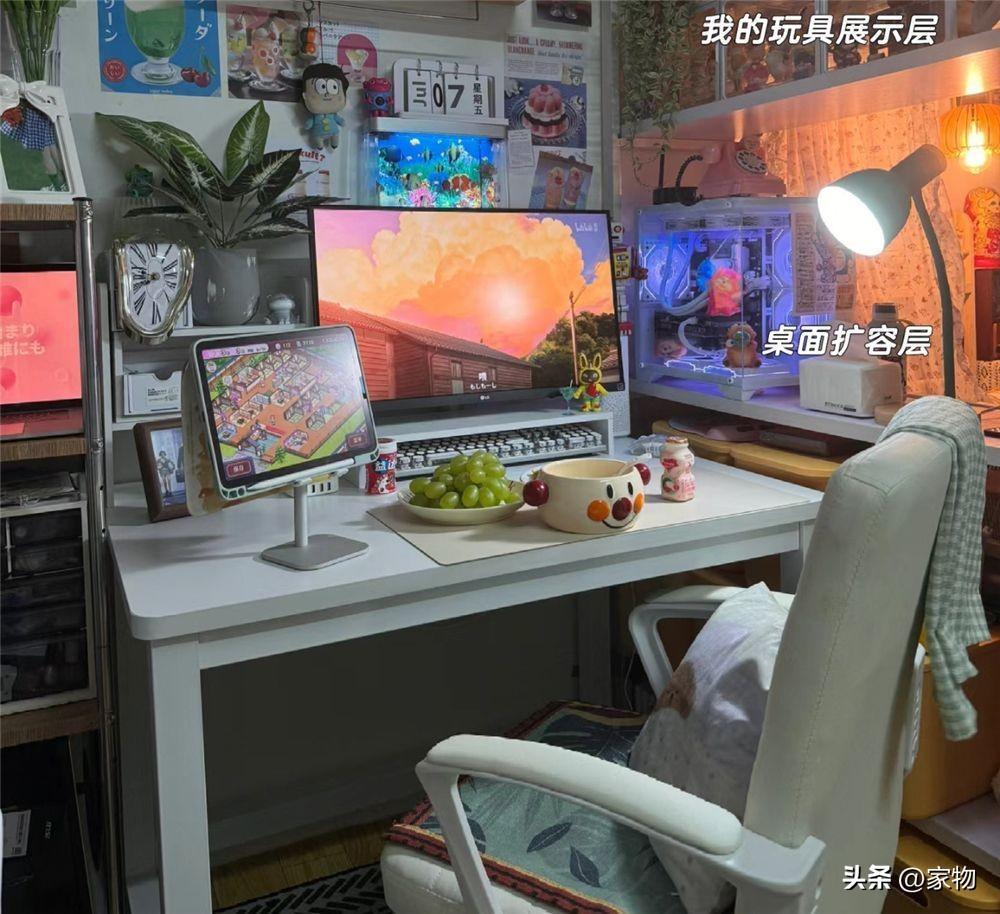 而家裏的書桌,則在牀頭下方位置,和梳妝檯幾乎是同一尺寸和樣式,坐在這裏學習、工作、玩玩遊戲都很不錯,周圍擺件裝飾和雜物雖然很多,但也都收拾過,呈現出亂中有序的感覺。