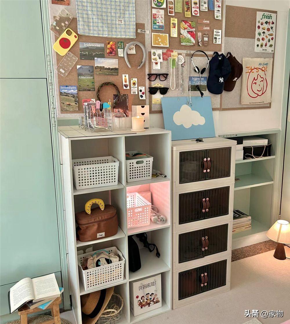 7㎡小屋內雖然東西很多,但卻又經過了精心的整理,左邊的開放式櫃格中,用一個個收納筐將零散的小件分類收納起來,右邊的櫃門內也可以收納各種雜物嗎,關上櫃門,雜亂隨即隱藏其中。