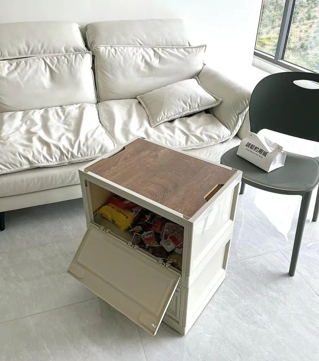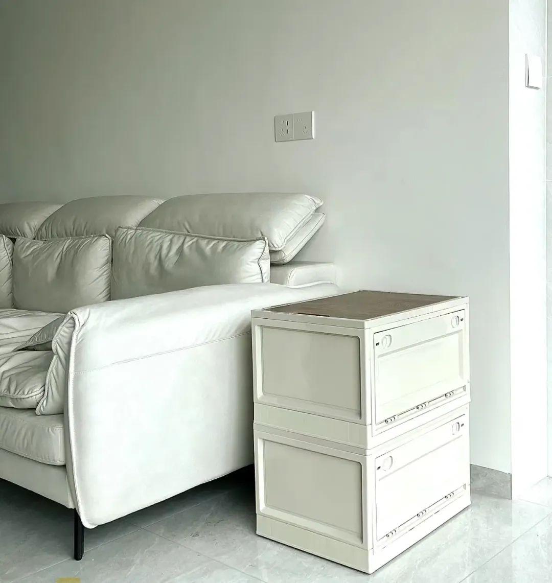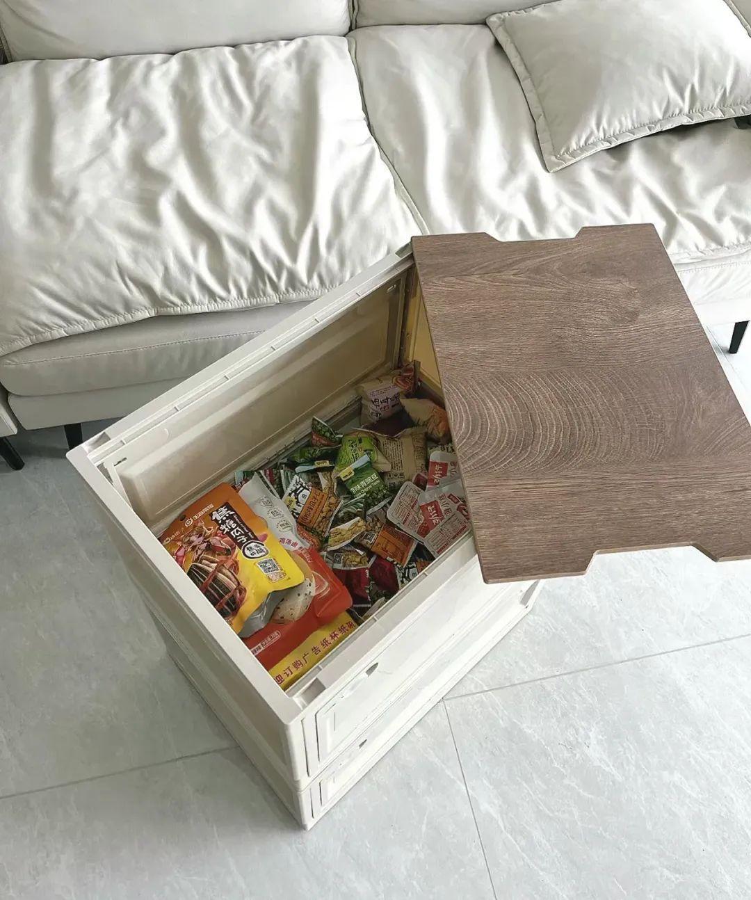 兩個箱子疊起來的高度正好和茶几高度差不多,桌面平整,可以放水杯;容量大,下層放不常用的雜物,上層放零嘴飲料,收納功能比茶几更強。