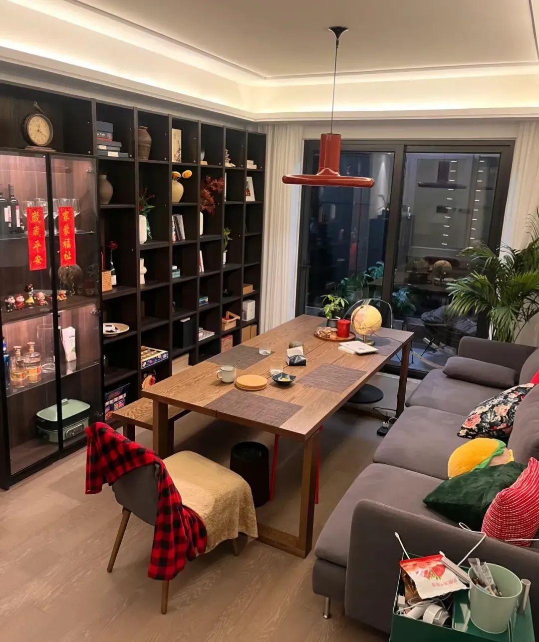 家裏人多,小圓桌面積不夠,則可以換成面積更大的方形條桌。一句話,要想客廳大,想辦法將功能類似的傢俱合二爲一,比如餐桌和茶几。
