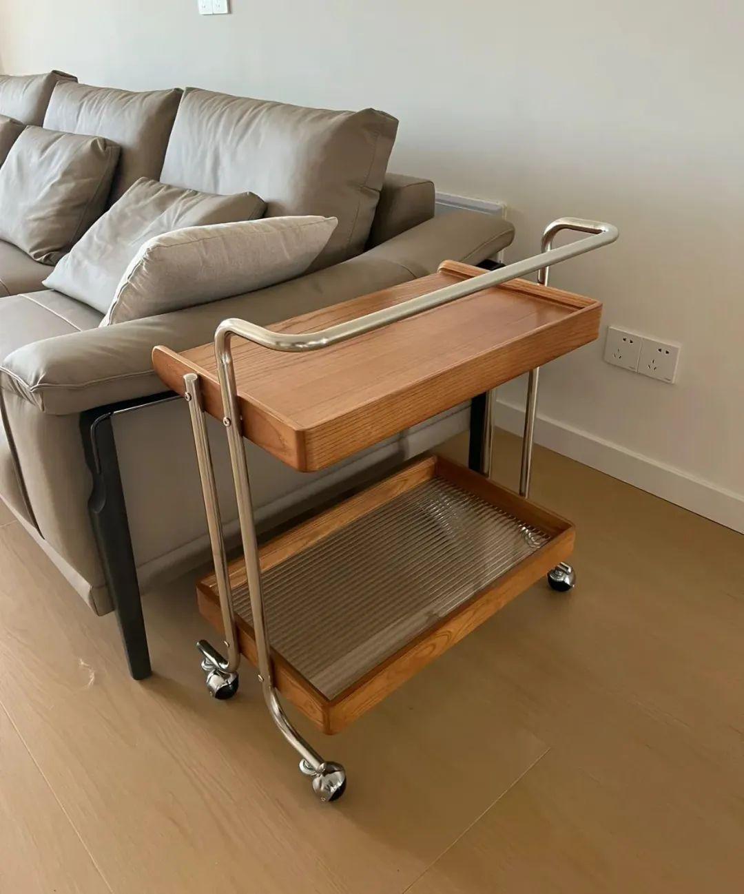 推車底面四個萬向輪,移動起來絲滑又沒有噪音。它的小桌板是可摺疊的,合起來後佔用空間小,不僅適合在客廳當茶几用,還能放牀頭雜物,剛好塞進牀和衣櫃的夾縫中。