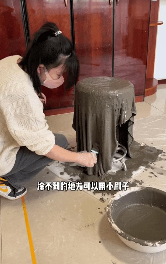 ②和水泥,將毛巾浸泡在水泥盆內,來個馬殺雞,全部浸透後拿出來攤在凳子上,四個毛巾腳着地,開始猛猛刷水泥,幹了一層之後再刷幾遍,越厚越穩。