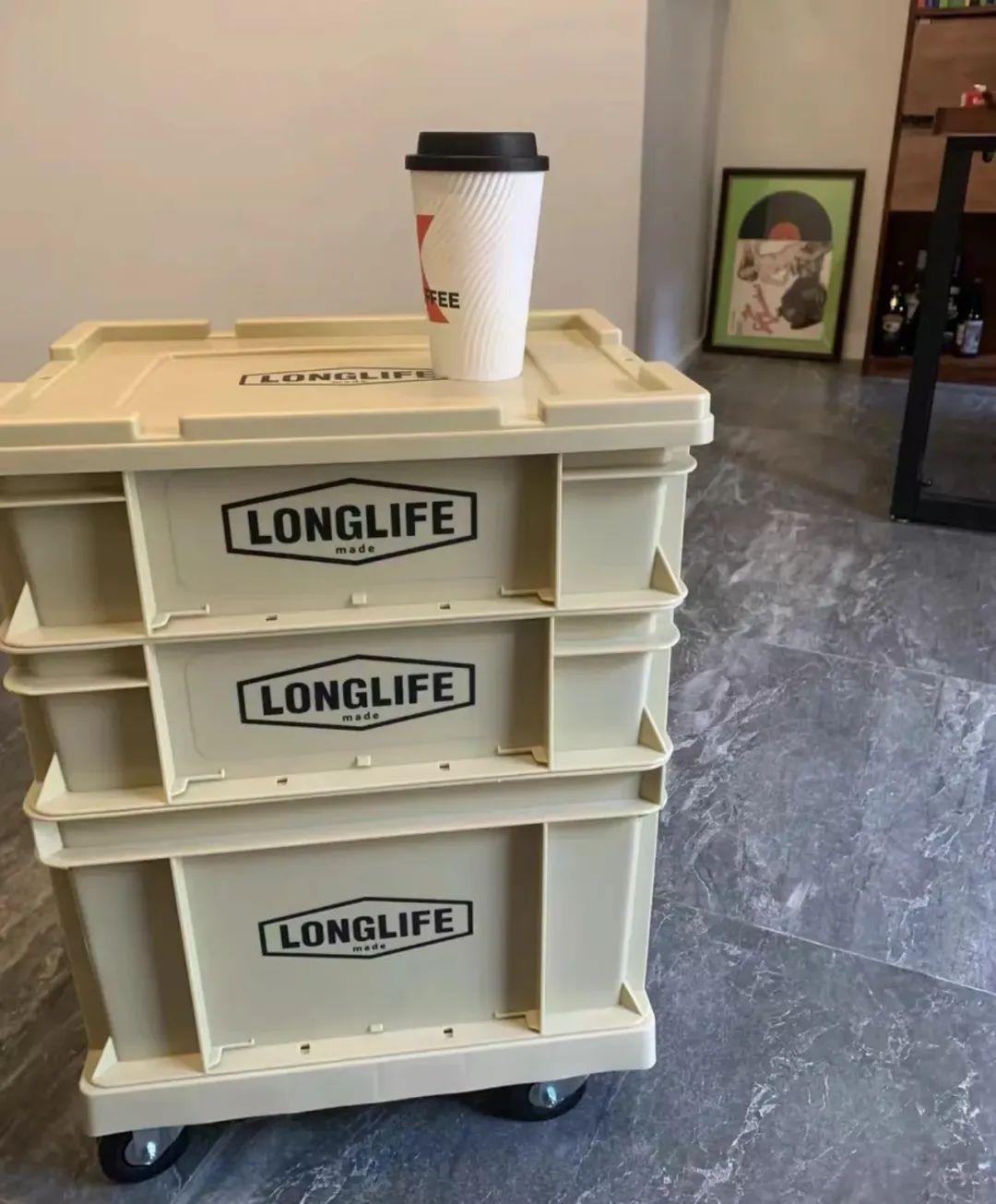除了戶外收納箱,這種底部帶滑輪的週轉箱,用起來也不錯。兩個一組合,也可以代替茶几,收納空間很優秀;雖然桌面不是全平,但有能放水杯的位置,凹凸的箱蓋,可以讓兩個箱子鑲嵌的更牢固。