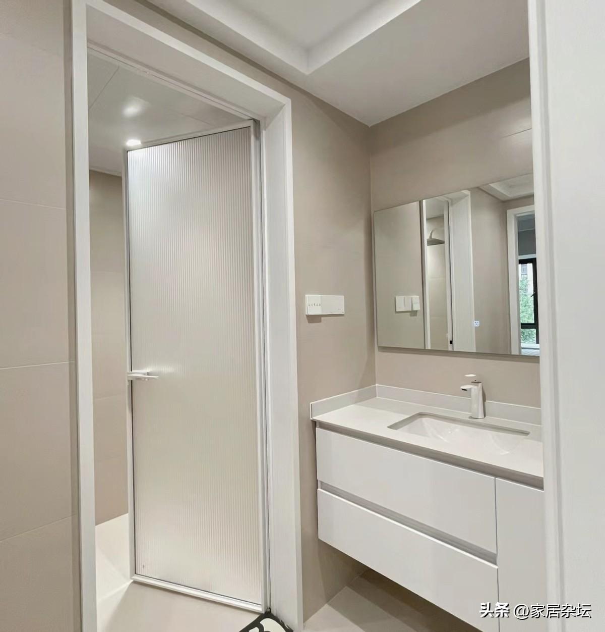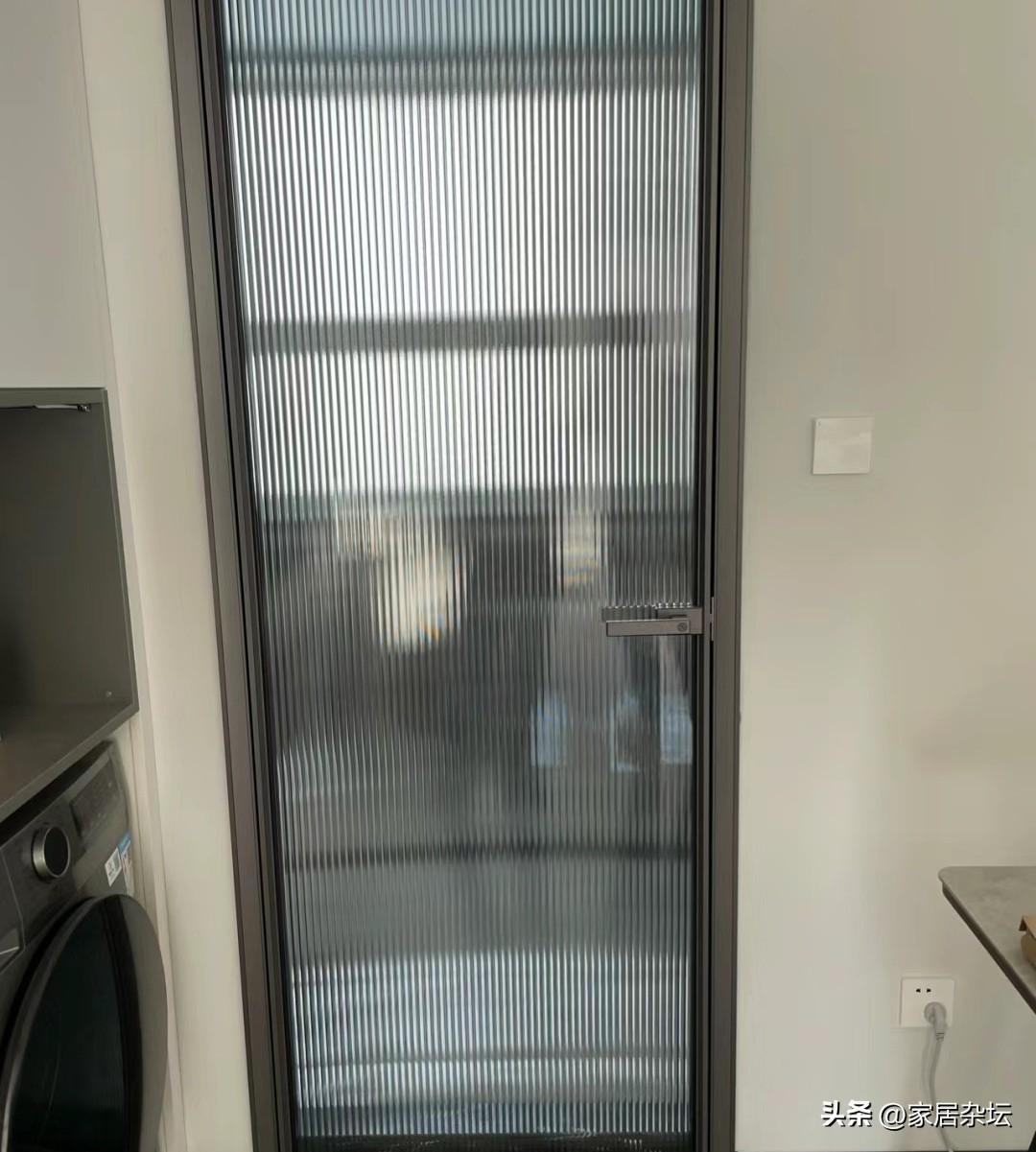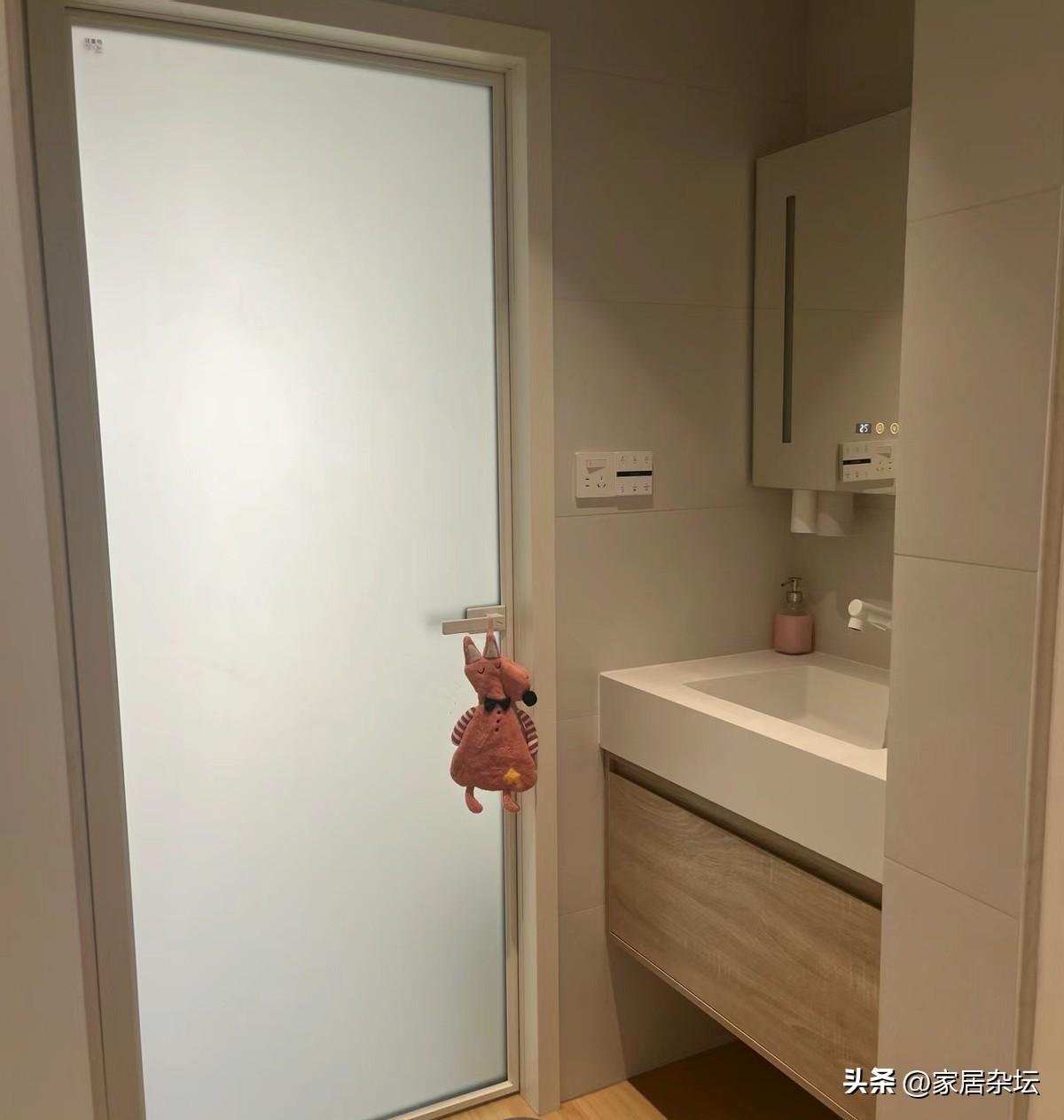 衛生間,建議大家就選擇玻璃門,別再用傳統的木門了。我家裏安裝的這個油砂玻璃,隔音效果真的很好,關了門以後聲音特別小。