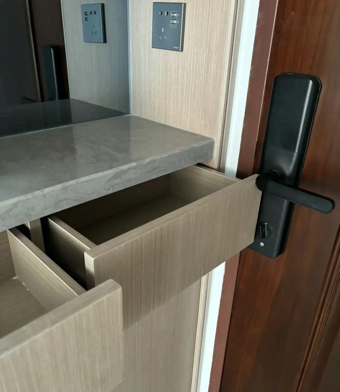 原本給玄關櫃做了兩個抽屜,想着以後收納雜物妥妥的,結果做完才發現,這是變相給門做了個防盜鏈,一開抽屜,完美抵住了大門,抽屜也只能開一小半。