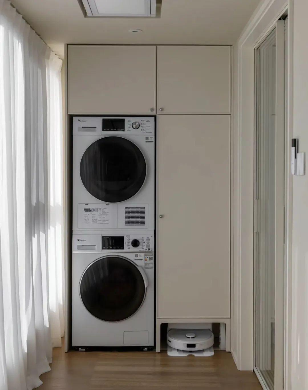 另一側裝洗衣機、烘乾機,還有收納櫃會也更合理。