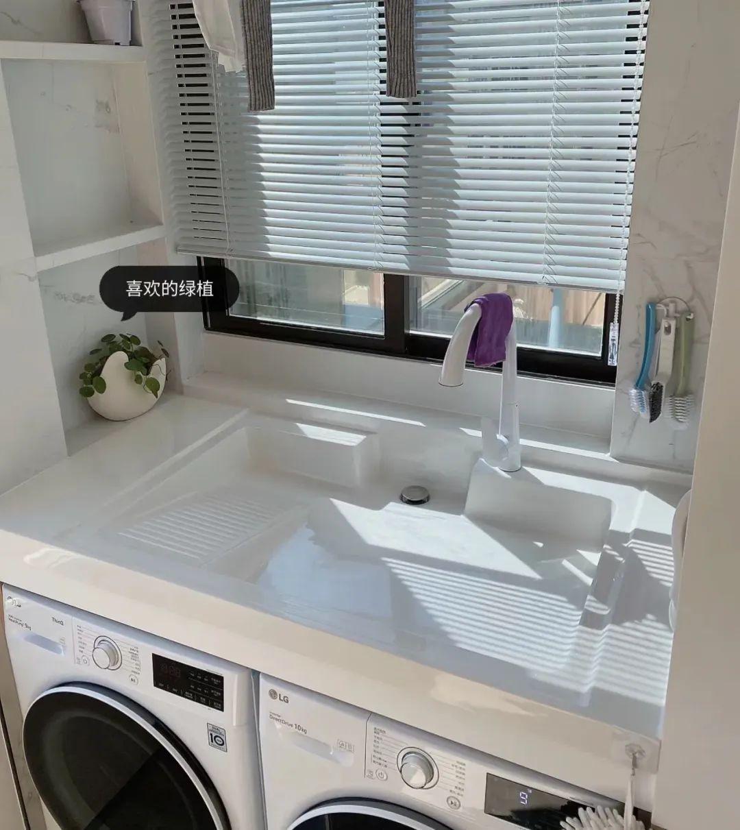 也有人會把面盆坐在洗衣機、烘乾機的上方,這個斜坡加棱角,好似能搓搓衣服,看起來很實用,但真用起來就發現,又踩雷了,盆子太淺,一開水龍頭,四處濺水。