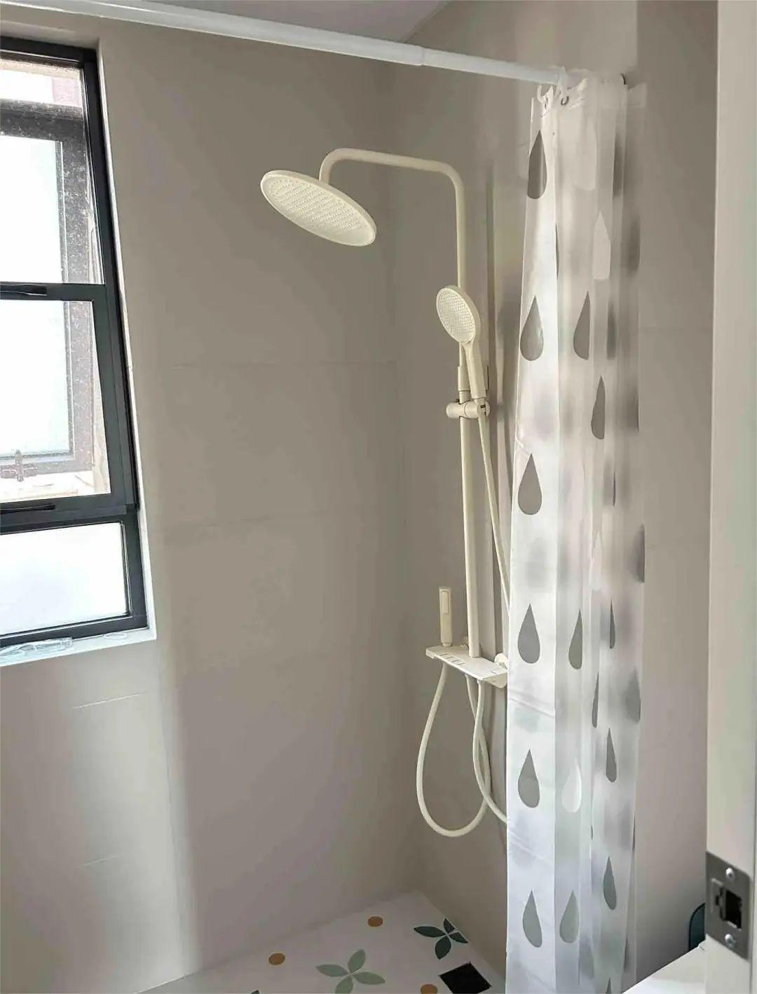衛生間太小的話,不一定非得做玻璃淋浴房。真不如用浴簾擋水,地面下沉也不會出現積水的情況。