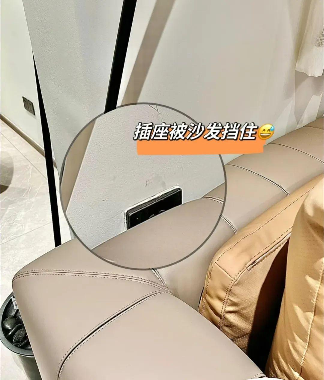 一般水電師傅把沙發插座做1m高度,沙發選擇時一定也要注意高度不超過1m,否則將出現上圖這種問題,插座被沙發擋住了.