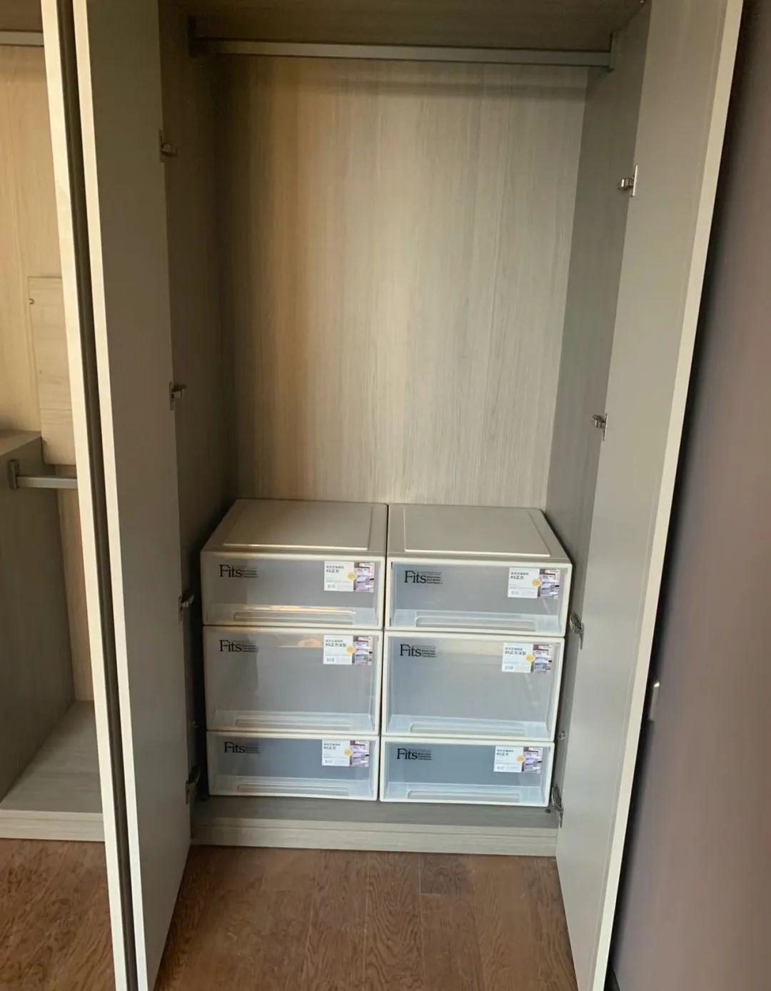 其實,我更建議在衣櫃內留一塊位置做成靈活掛衣區,各種長度的衣服都能掛下,下方空餘的地方用尺寸合適的抽屜式收納盒。