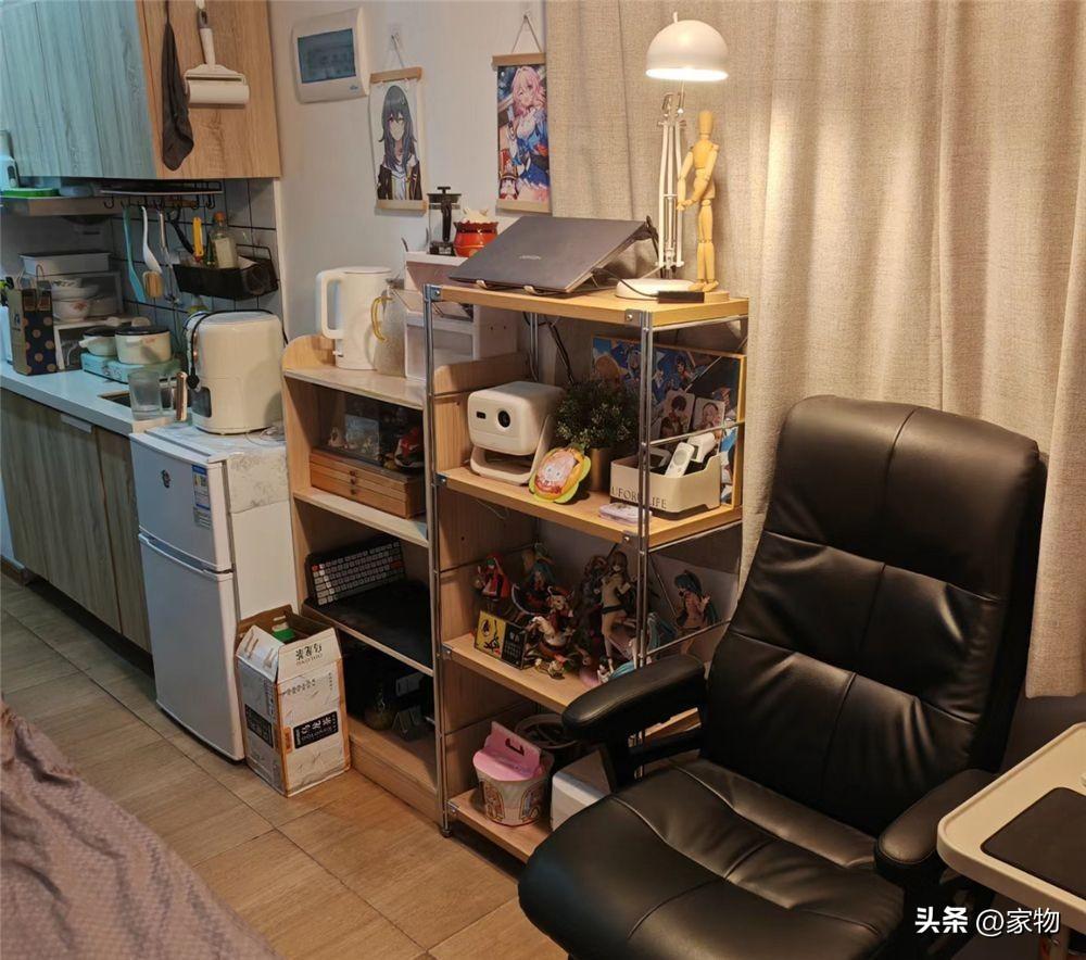 這張小椅子的旁邊,是兩組收納架,多層收納架上放着各種手辦擺件,都是這位深圳小哥平日裏的興趣愛好,投影儀順勢放在架子上,可以向對面牆上投射出觀影畫面。