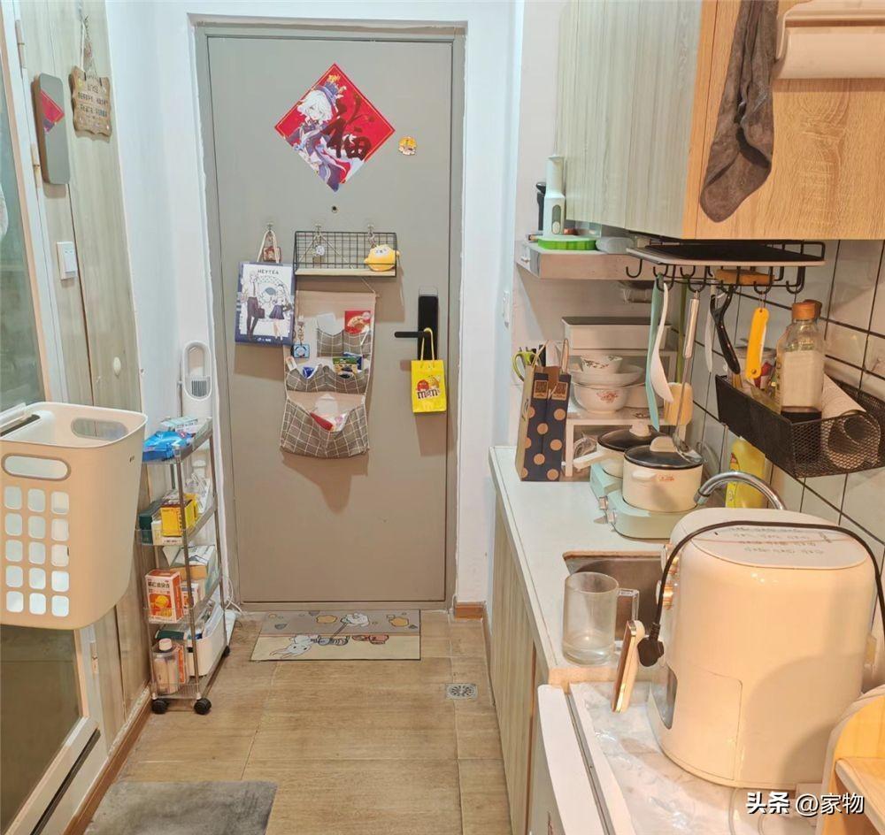 底部的檯面下方,也可以收納碗碟餐具,旁邊擺上一個小冰箱,別看家裏的廚房面積不大,但該有的功能全都有,生活在這裏,起碼做飯喫飯都還是挺方便的。