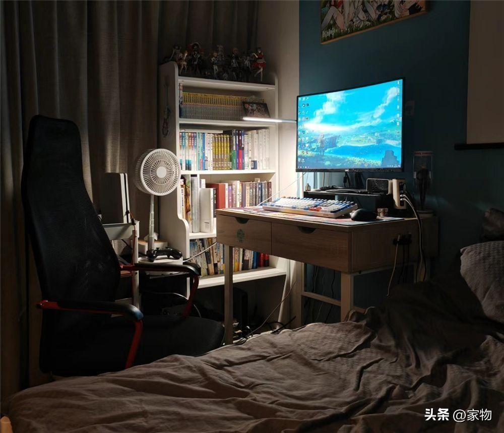 牀尾放上一張小小的書桌,平日裏他都會在這裏工作或玩遊戲,或許這處書桌的小角落,也是平日裏他最常待的地方,旁邊的書架,更是整齊有序收納着家裏各種書本雜物,看起來分外整潔。