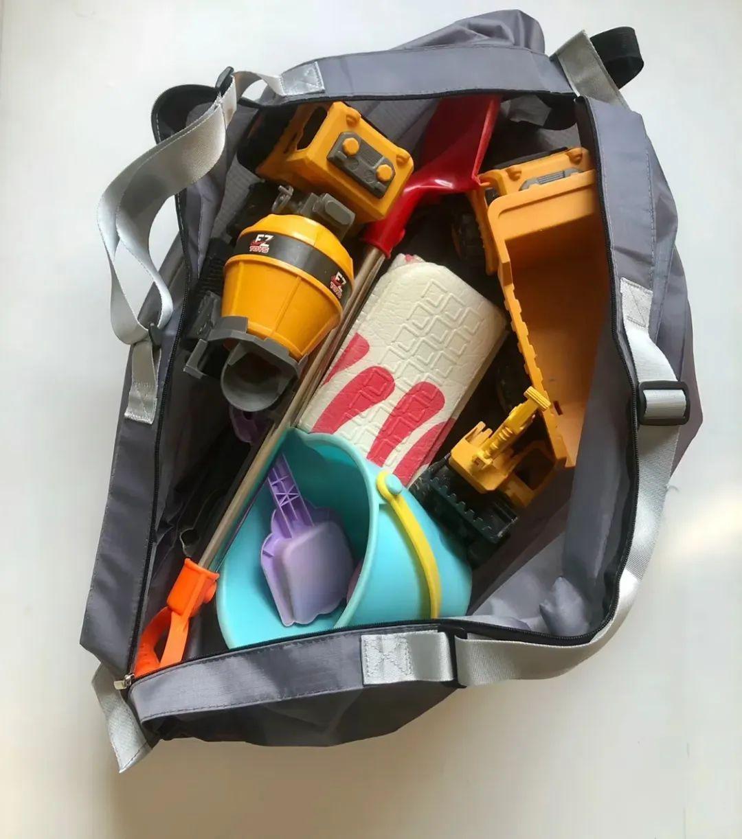 它的面料還是那種防水尼龍布,非常耐磨,又不怕髒,暑假出遊,裝上億點點多的小玩具,娃快樂,咱也舒坦。