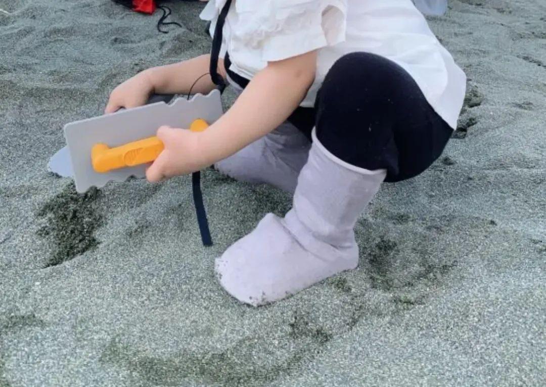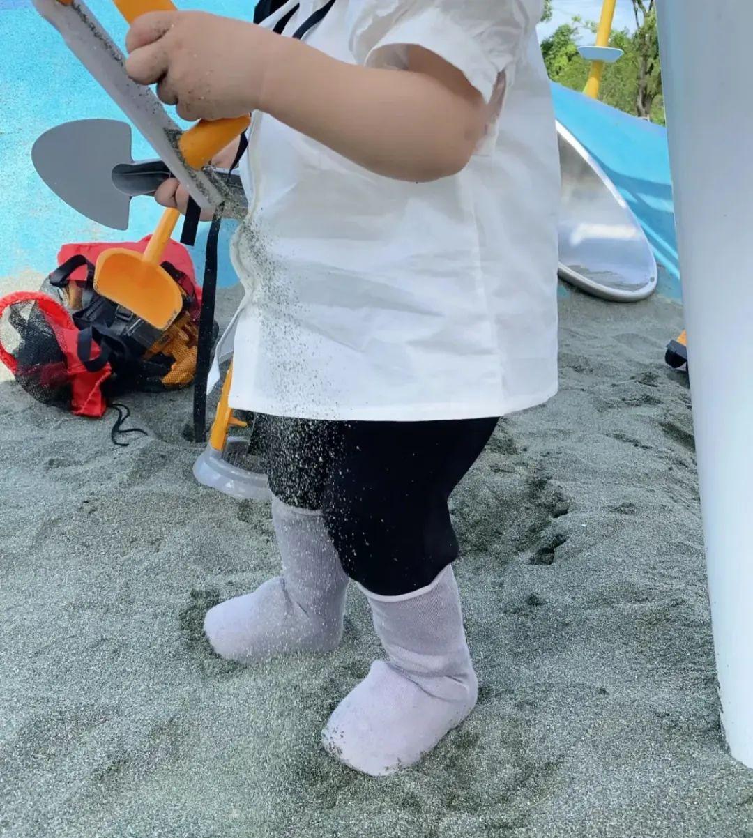 有時候沒找着鞋套,我會用家裏的舊襪子充當一次性裝備,襪子自帶彈力,穿上去可以牢牢的固定在小腿上,小朋友玩完沙子直接扔掉,不用帶回家清洗。