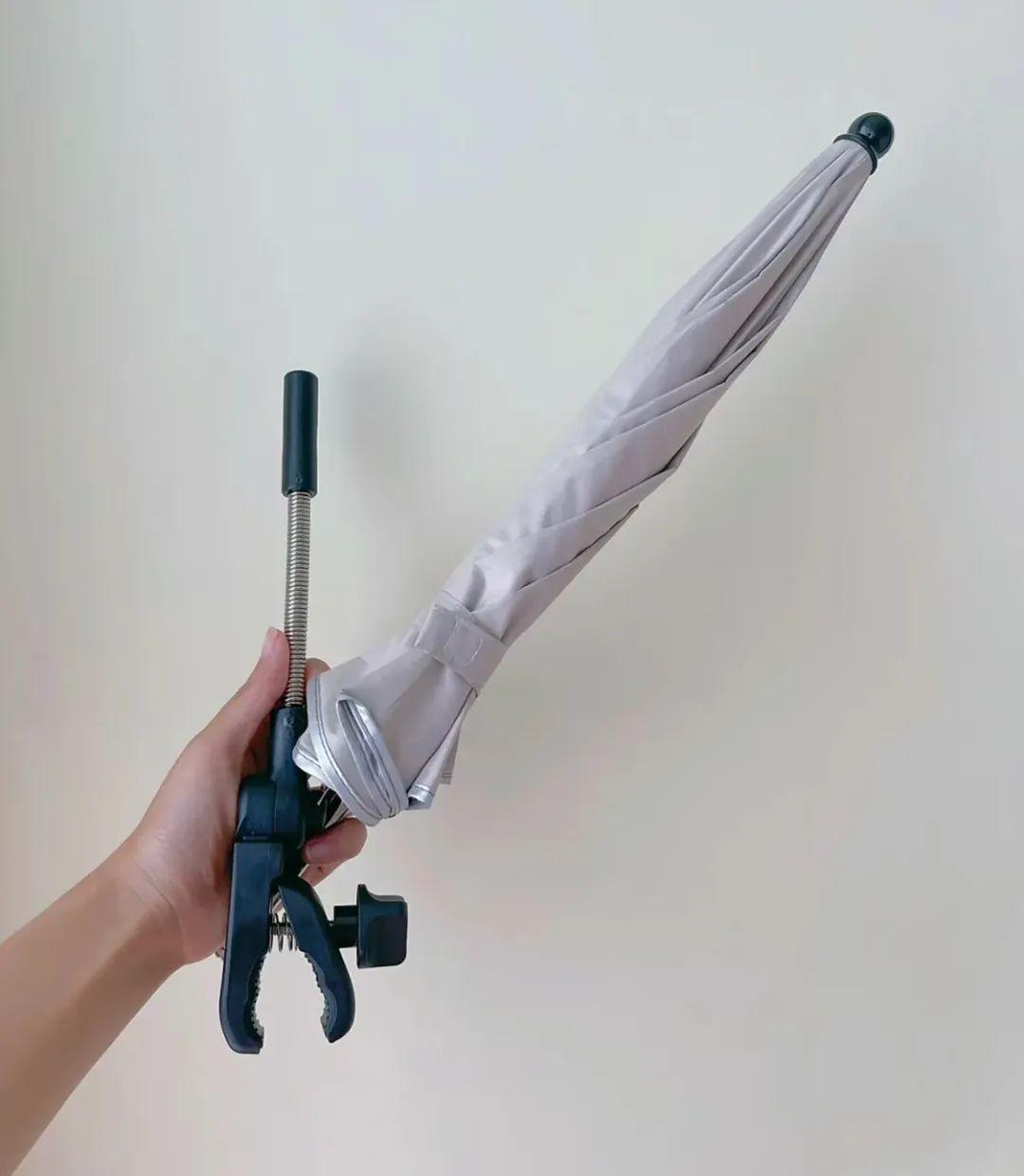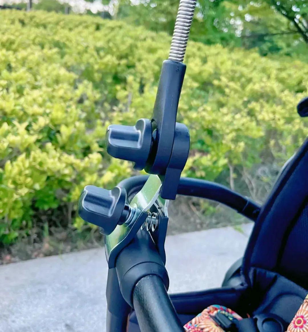 它上面是一個正常的遮陽傘,下面有一個可以調節鬆緊的卡扣,車上幾乎任何位置都能裝上。