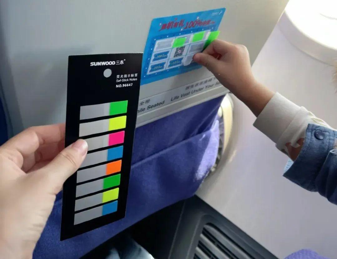 我給他準備的安靜玩具更簡單,辦公用的的便籤紙貼,讓他自由發揮想象力,在小桌板上貼出自己喜歡的形狀,時不時的猛誇一下,情緒價值給到位,直到安全下車!