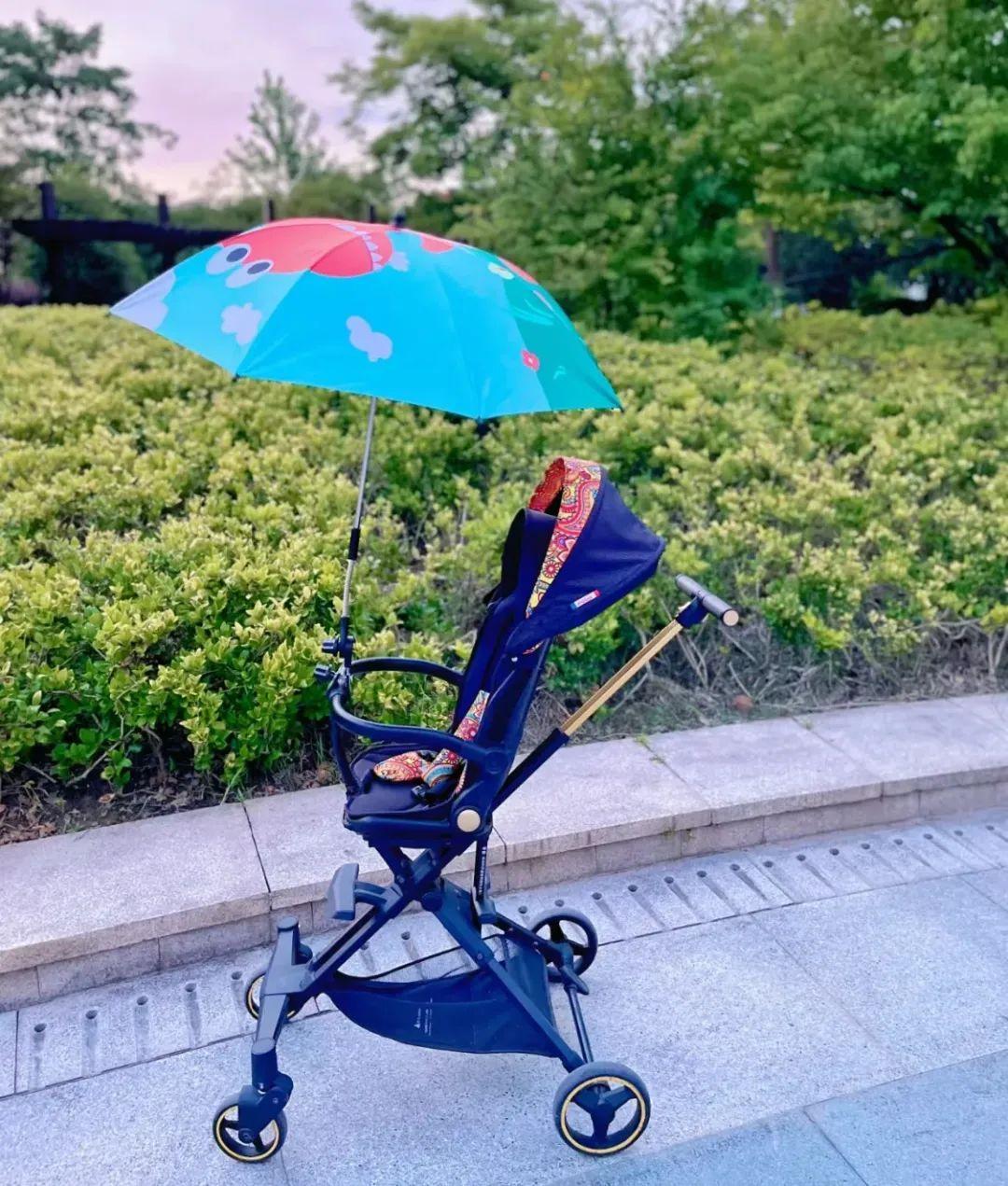 傘柄還可以調節方向,太陽在哪邊轉到哪邊去,避免陽光直曬到寶寶,直接拆下來也能當兒童遮陽/雨傘用。