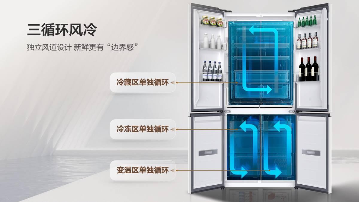 而三循環系統指的是冷藏室、冷凍室、變溫室三個艙室保持獨立的風道設計,形成單獨的冷氣循環迴路。艙室之間的空氣循環物理隔絕,風道專用,避免艙室間串味。同時還能讓空氣維持在流動的狀態,從而保持食物的新鮮度。