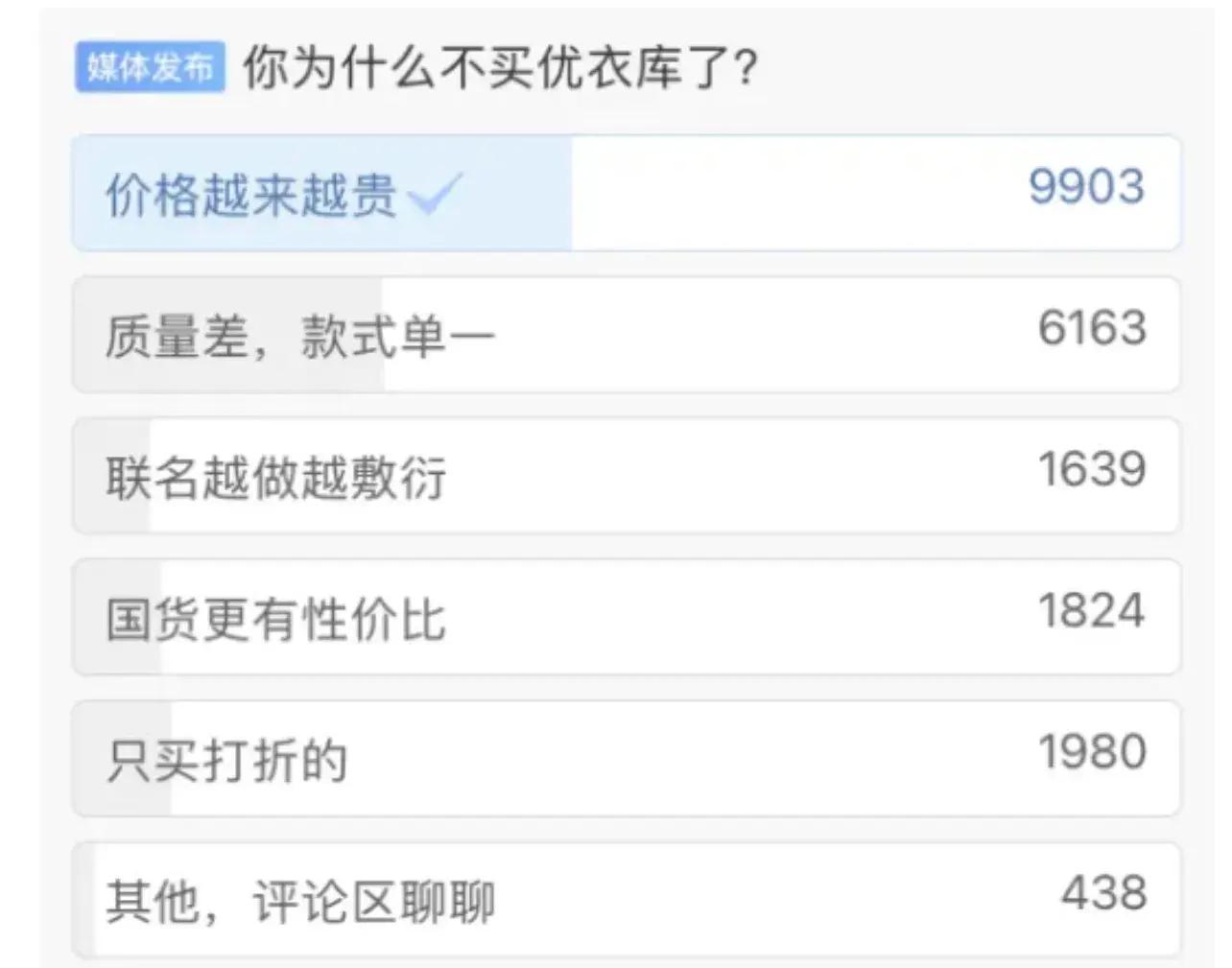 某媒體就曾做過調研,爲什麼你不買優衣庫了,結果原因選越來越貴的人最多,然後是質量差、款式單一,而且,這兩個的總和,佔到了總參與人數的70%以上。