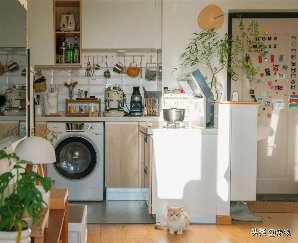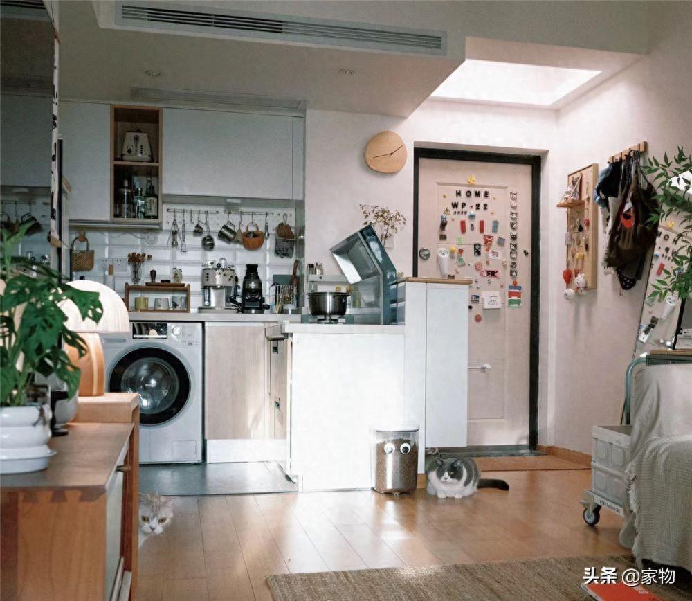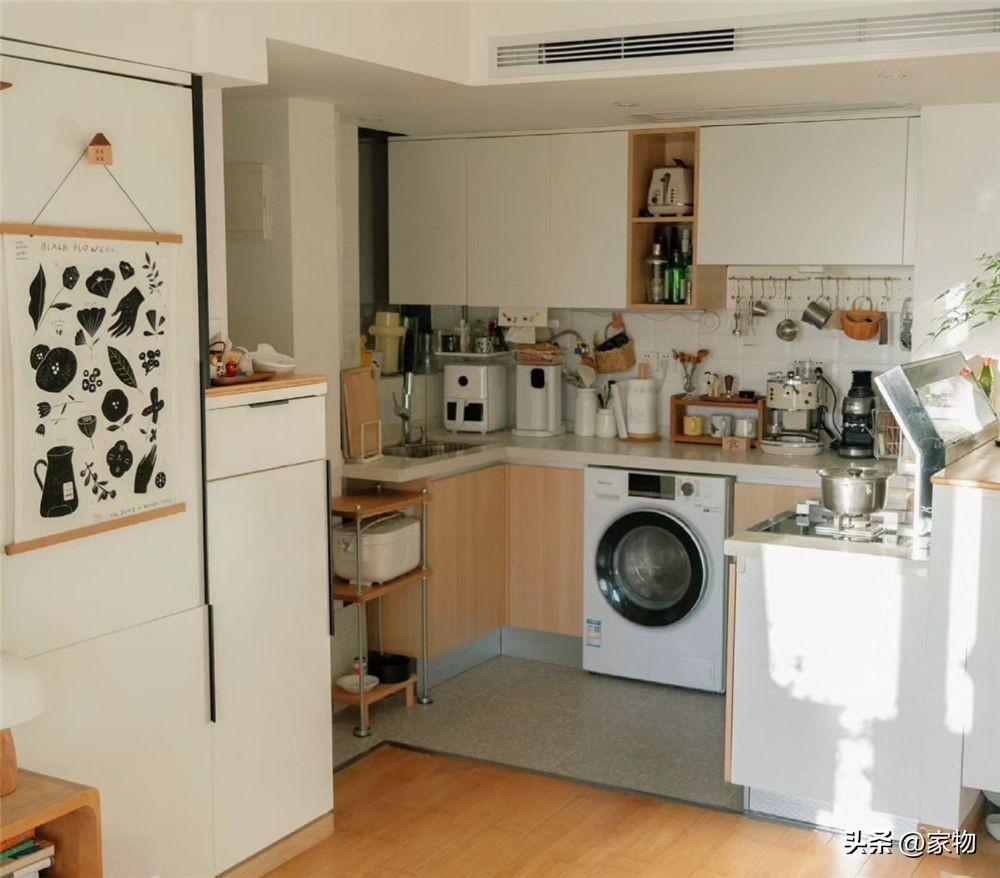 若說這個家裏有什麼地方最爲吸引我,個人感覺當屬這間U形的開放式廚房,廚房內底櫃嵌入洗衣機,一側做吊櫃,讓整個廚房變成U形格局,烹飪做飯都很順手。