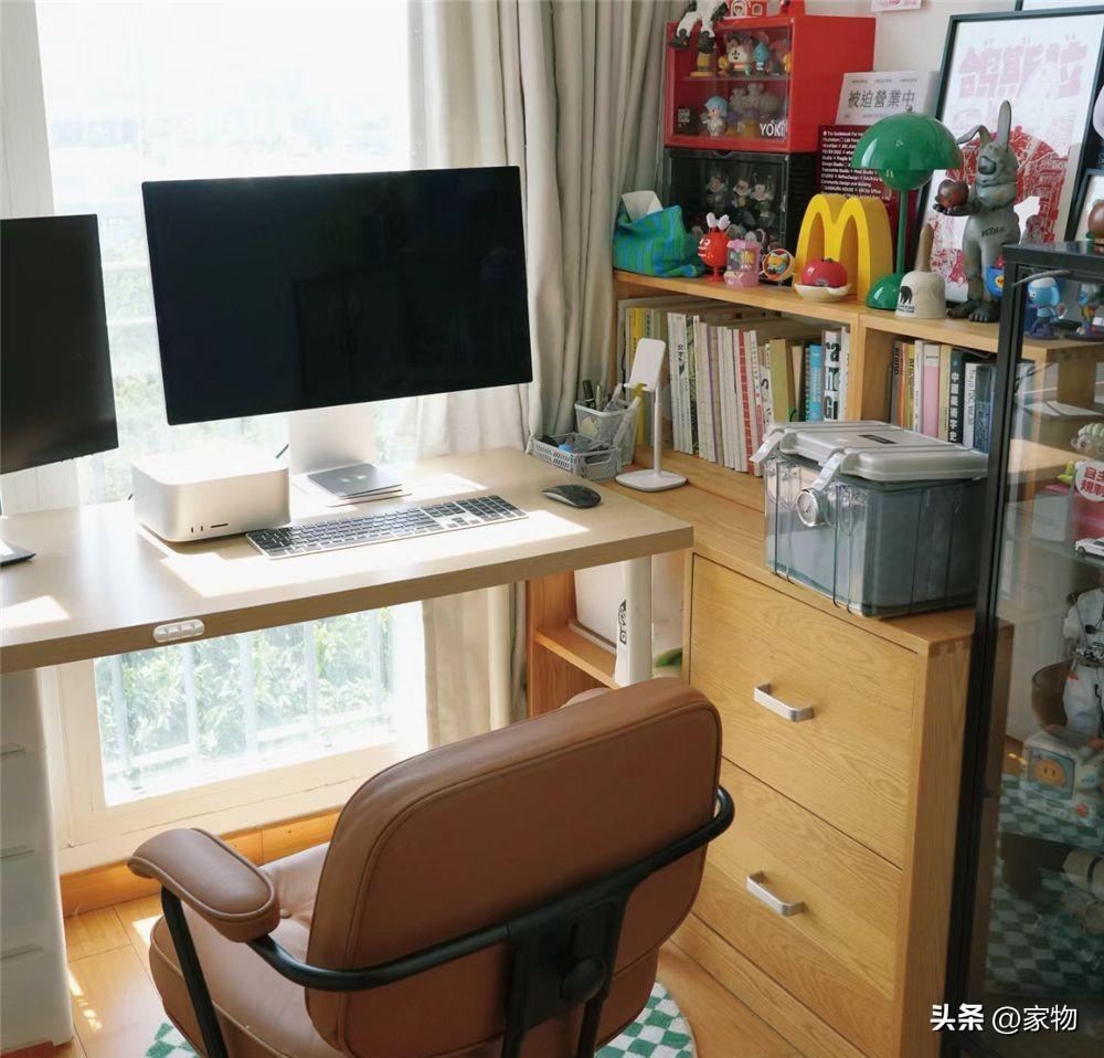 陽臺上有一張小書桌,真是將每一寸空間都充分利用了起來,桌面正對窗戶,採光充足,旁邊的櫃子側向擺放,收納着書本文件等各種物品,使用時隨手拿取很方便。