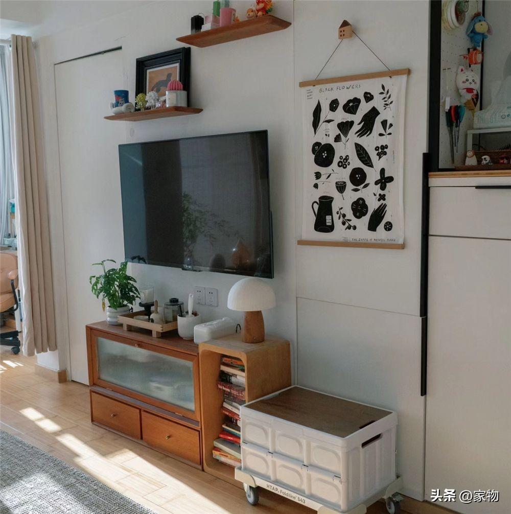 電視牆的位置其實比較擁擠,掛上電視機後,底部只能放一張較小的電視櫃,裏面可以收納各種各樣的小件雜物;而旁邊則做收納箱收納架和櫃子,豐富客廳內的收納。