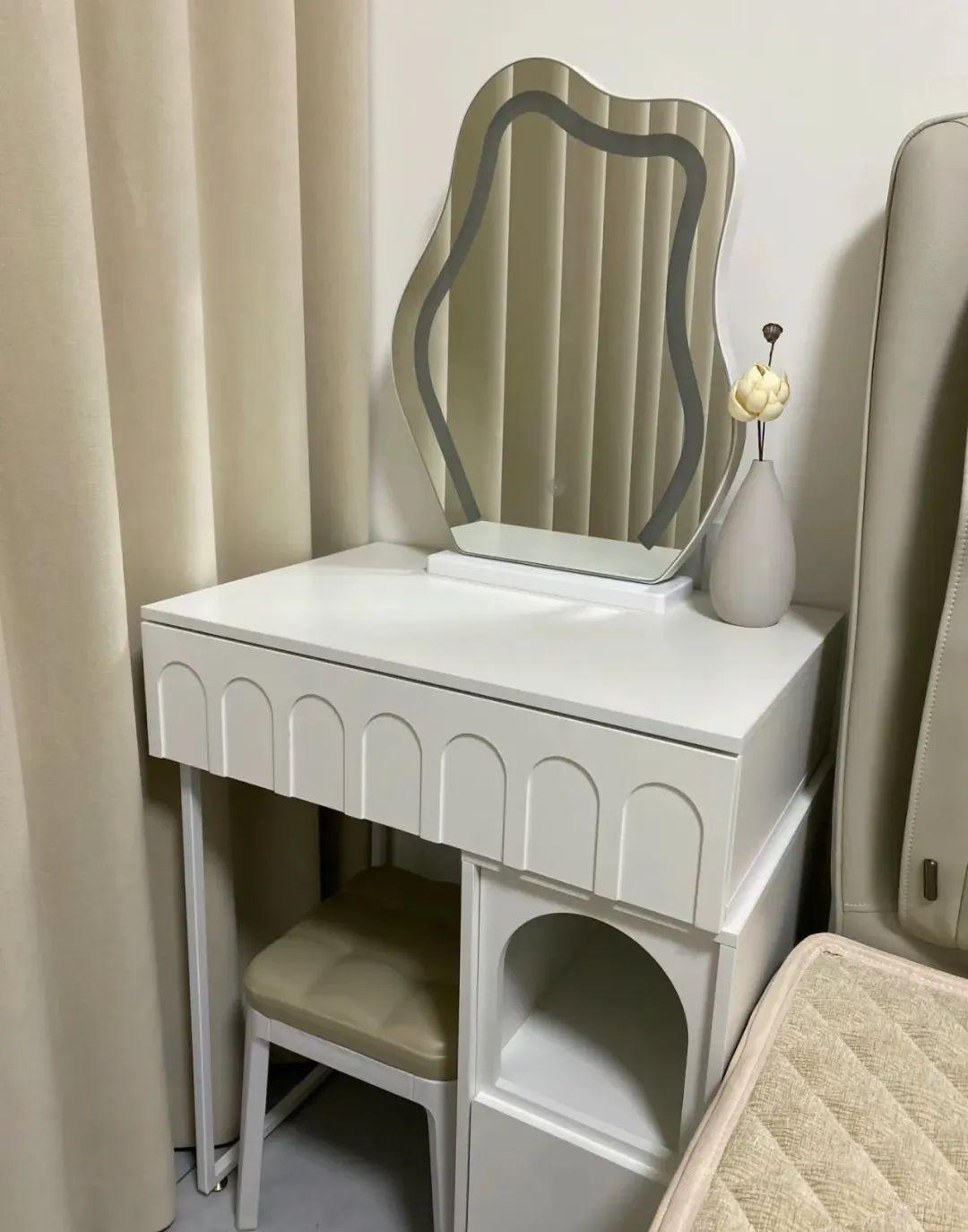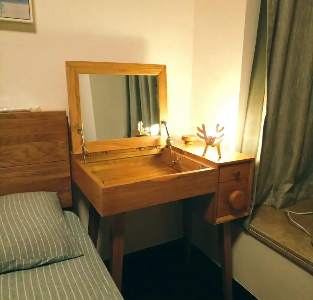 將梳妝桌和鬥櫃二合一,既得到了足夠大的桌面,也擴充了化妝品的收納空間。而且櫃體深度只有40公分,比常規梳妝桌小,所以對着鏡子化妝也看得清人臉。